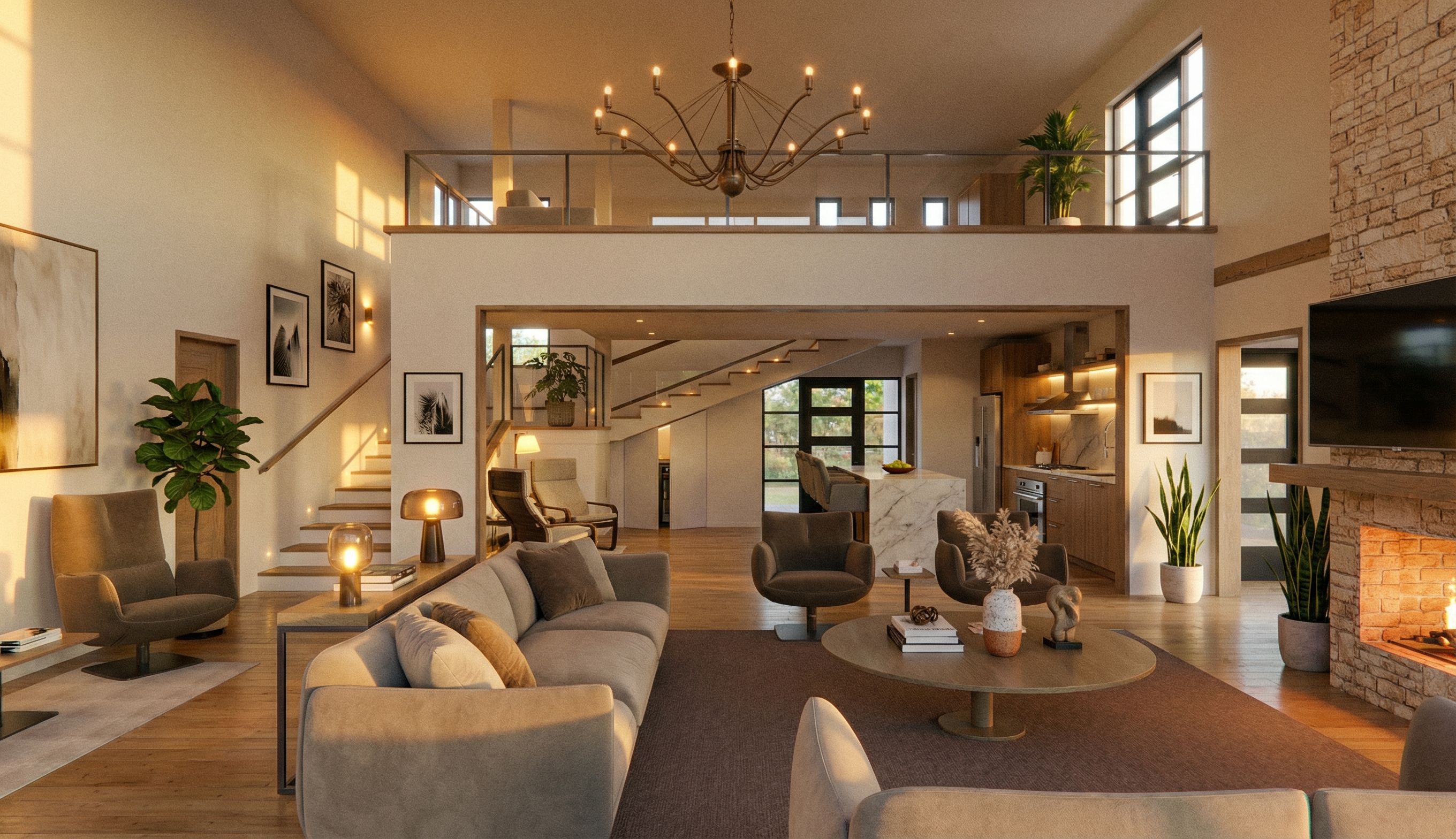 PromptAn expansive, open-plan interior living space features a comfortable sofa and several armchairs arranged around a round coffee table on a large area rug. Above, a mezzanine level with a glass railing overlooks the living room, accessible by an elegant staircase with wooden treads. A prominent brick fireplace with coral stone cladding and a mounted television anchors one wall. In the background, a modern kitchen with an island, appliances, and cabinetry is visible. Large windows throughout the space allow bright natural light to illuminate the scene., keep exact camera angle