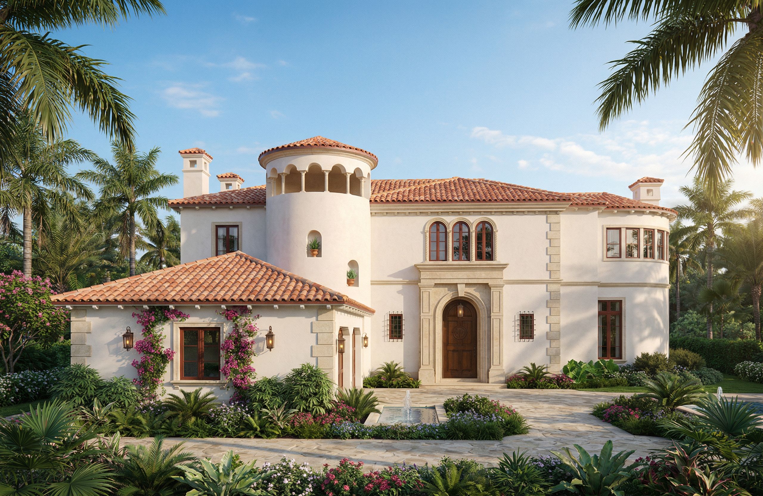 PromptPhotorealistic Mediterranean House Rendering Prompt (with Massing Cues) Ultra photorealistic architectural rendering of a Mediterranean / Palm Beach style residence using the provided elevation drawing as the exact architectural blueprint. CRITICAL: The elevation drawing defines all architecture. Do not alter the massing, proportions, roof geometry, or placement of windows and doors. Follow the elevation exactly. Massing Description (must match the elevation) The house is composed of three primary masses with clear hierarchy: 1. Central Entry Mass Two-story rectangular volume Main architectural focal point Large arched entry door with classical surround Directly above the entry is a triple arched window composition Hip roof with terracotta barrel tiles Slightly taller than adjacent masses 2. Left Tower Mass Cylindrical tower element projecting from the main façade Two stories with an open arcaded belvedere at the top Series of evenly spaced arches supported by slender columns Topped with a circular tiled roof Smooth white stucco exterior 3. Right Wing Two-story rectangular wing Features a semi-circular two-story bay window Bay projects slightly from the wall plane Simple Mediterranean window composition Hip roof with clay tiles 4. Garage Wing (front projecting mass) Single story garage volume Located in front of the left portion of the house Three garage bays beneath a low terracotta tiled hip roof Attached to the main structure but clearly a secondary mass Architectural Style Classic Mediterranean / Palm Beach villa architecture: Smooth white stucco walls Terracotta clay barrel tile roofs Light limestone or cast stone trim Stone quoin corners Mediterranean arches Dark stained wood doors and windows Traditional lantern sconces Materials (match reference image) Warm white plaster / stucco Natural terracotta clay roof tiles Light limestone architectural trim Dark wood entry door Bronze or black metal lantern lights Landscape and Site Context Use the reference render style for landscape: Tropical South Florida garden Palm trees and layered tropical planting Bougainvillea climbing along the loggia Lush greenery and flowering plants Mediterranean courtyard feeling Natural stone paving Reflecting pool or water feature near the front garden Lighting Late afternoon 3 PM Florida sunlight Warm natural lighting Soft shadows Front façade illuminated Blue sky with light clouds Camera View Slight architectural perspective Eye level 28–35mm architectural photography lens Entire façade visible Real estate photography composition front on elevation rendering matching the provided elevation drawing. Rendering Style Ultra photorealistic architectural visualization High detail materials Realistic vegetation Luxury Mediterranean estate aesthetic Cinematic architectural rendering Negative Instructions (VERY IMPORTANT) Do not modify the architecture Do not redesign the massing Do not move windows or doors Do not change roof shapes Do not add balconies or terraces not shown in the elevation Do not reinterpret proportions Do not use reference for architectural details only use elevation for main architectural details do not use reference for rendering style only use reference for landscaping and hardscape and for material types and locations, keep exact camera angle