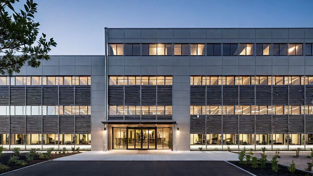 PromptPhoto of an industrial facility, showcasing a modern design with sleek lines and small glass windows. The exterior features a combination of textured gray panels and reflective surfaces, highlighting its contemporary architecture. Surrounded by open landscaping with sparse vegetation and a gravel path, the setting includes nearby industrial elements in the distance. Bright daylight casts soft shadows across the facade, enhancing the building's details. Captured from a low angle to emphasize the height and imposing structure, with a wide lens to include the environment.