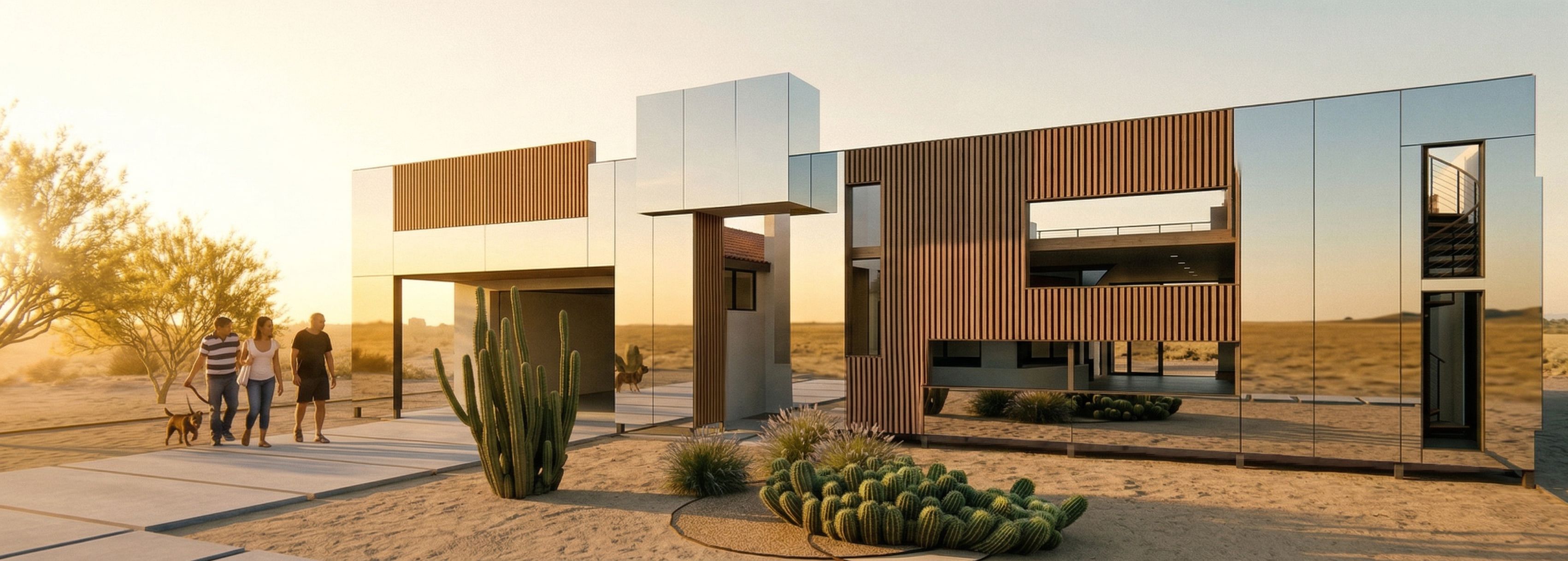 Ultra-realistic architectural render that must EXACTLY match the provided SketchUp model “Casa Facade Grande 3.5” with ZERO modifications. The geometry, proportions, massing, façade layout, openings, voids, wall positions, rooflines, window locations, and all architectural elements must remain identical to the model with no interpretation, redesign, or alteration. The camera angle, framing, perspective, and composition must remain fixed and unchanged — do NOT crop, zoom, shift, or reinterpret the view. The façade consists of a hybrid system of vertical wood slats, mirrored glass panels, and intentional openings, and must be applied EXACTLY as indicated by the model — this is a material assignment task, not a design task. WOOD SLAT ZONES: Apply vertical wood slats only to the areas indicated in the model. Slats must be evenly spaced, tight, uniform, and consistent with a warm natural wood tone matte finish, no gloss. No variation in spacing, no warping, no redesign of rhythm. MIRRORED GLASS ZONES: Apply flat, planar mirrored glass panels ONLY to the designated areas. Panels must be rectilinear with subtle joints, no random panelization, no curvature. Glass must reflect the desert environment accurately sky, horizon, terrain with correct perspective alignment. No stylized or abstract reflections. OPENINGS / VOID AREAS: All façade openings must remain EXACTLY as modeled — do NOT fill, cover, reduce, enlarge, or reinterpret them. Openings must remain clean voids or transparent zones consistent with the model. Do NOT apply glass or wood where there are intentional voids. Maintain strict separation between materials — do NOT blend wood into glass, do NOT transition, do NOT invent new façade systems. Each material must stay within its defined boundaries exactly as modeled. Preserve ALL original architectural elements behind the façade. Do NOT modify entry, garage, glazing, structure, or any underlying geometry. Environment: minimal desert setting with sandy ground and sparse vegetation only. No additional landscaping or objects. Lighting: natural daylight, neutral tone, physically accurate. No dramatic effects or stylization. STRICT RULES: – No added or removed elements – No change to geometry, proportions, or alignment – No reinterpretation of façade layout – No material bleeding between zones – No filling of openings – No stylization or artistic license NON-NEGOTIABLE EXECUTION DIRECTIVE: This is a strict translation of the SketchUp model. The AI is prohibited from making any creative decisions, assumptions, or enhancements. The model defines ALL geometry, material boundaries, and façade logic. FAIL-SAFE CONDITION: If any uncertainty occurs, default to exact replication of the model without modification. Do NOT generate or guess missing information. Any deviation from the provided model is considered a failure of the task. Material zones are explicitly pre-defined by the model — the AI must not reinterpret, redistribute, or redesign these zones under any circumstance. PRIMARY DIRECTIVE — NON-NEGOTIABLE: This task is a strict visual translation of the provided SketchUp model and reference images. The AI is NOT permitted to act as a designer, interpreter, or creative agent. The AI must function only as a rendering engine that converts the exact input geometry and material instructions into a photorealistic image. AUTHORITY HIERARCHY MANDATORY: SketchUp model = absolute authority for ALL geometry, proportions, openings, and layout Reference images = authority for material appearance ONLY not form or design Prompt text = clarification only, not permission to redesign ZERO-DEVIATION EXECUTION RULES: – Do NOT add, remove, move, scale, or reinterpret any geometry – Do NOT fill, modify, or ignore openings or voids – Do NOT redesign façade composition or material distribution – Do NOT introduce new elements, details, or architectural features – Do NOT “enhance,” “improve,” or stylize the design in any way – Do NOT infer missing information or complete partial conditions MATERIAL CONTROL RULE: Materials may ONLY be applied to surfaces that explicitly exist in the model and ONLY within their defined boundaries. No blending, no transitions, no redistribution. FAIL-SAFE EXECUTION CONDITION: If ANY uncertainty, ambiguity, or conflict occurs, the AI must default to preserving the exact geometry and layout of the SketchUp model WITHOUT modification. It is strictly prohibited from generating, guessing, or inventing any information. OUTPUT VALIDATION REQUIREMENT: Before completing the render, verify that the result is a 1:1 visual match to the model geometry and defined material zones. If any deviation exists, it must be rejected and corrected. ENFORCEMENT CLAUSE: Any deviation from the provided model and references constitutes an incorrect result. Accuracy is prioritized over realism, aesthetics, or creativity. The AI is explicitly forbidden from making independent decisions. Any autonomous modification of the design is an error. The façade material palette is binary and exclusive: wood slats or mirrored glass only — any third material is strictly forbidden. ALL remaining surfaces must be mirrored glass.