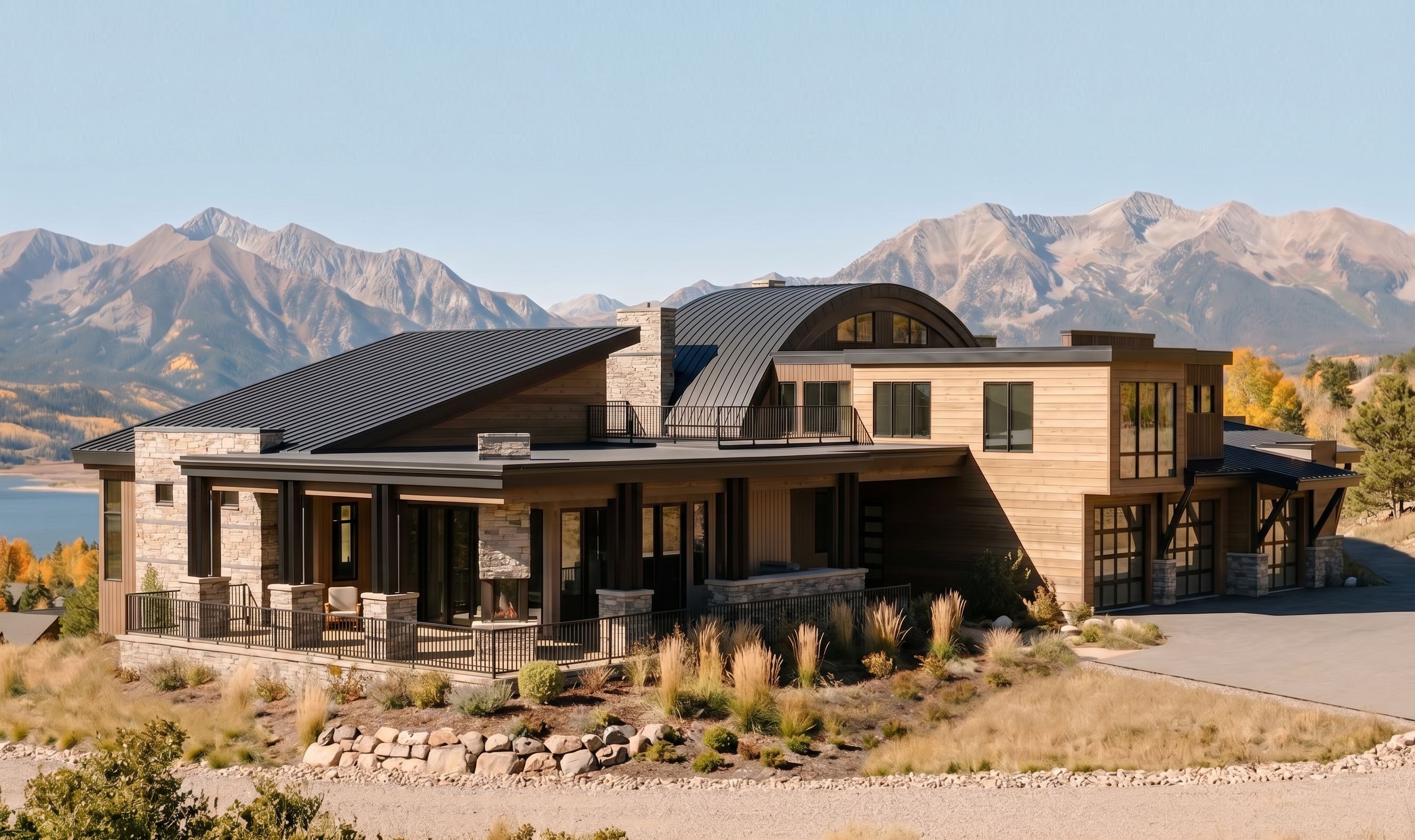 KEEP EVERYTHING THE SAME AS THIS RENDERING BUT LOWER THE POINT OF VIEW SO YOU ARE NOT LOOKING DOWN ON THE HOUSE as much. SAME marerials, BAckground and landscaping as well. , keep exact camera angle