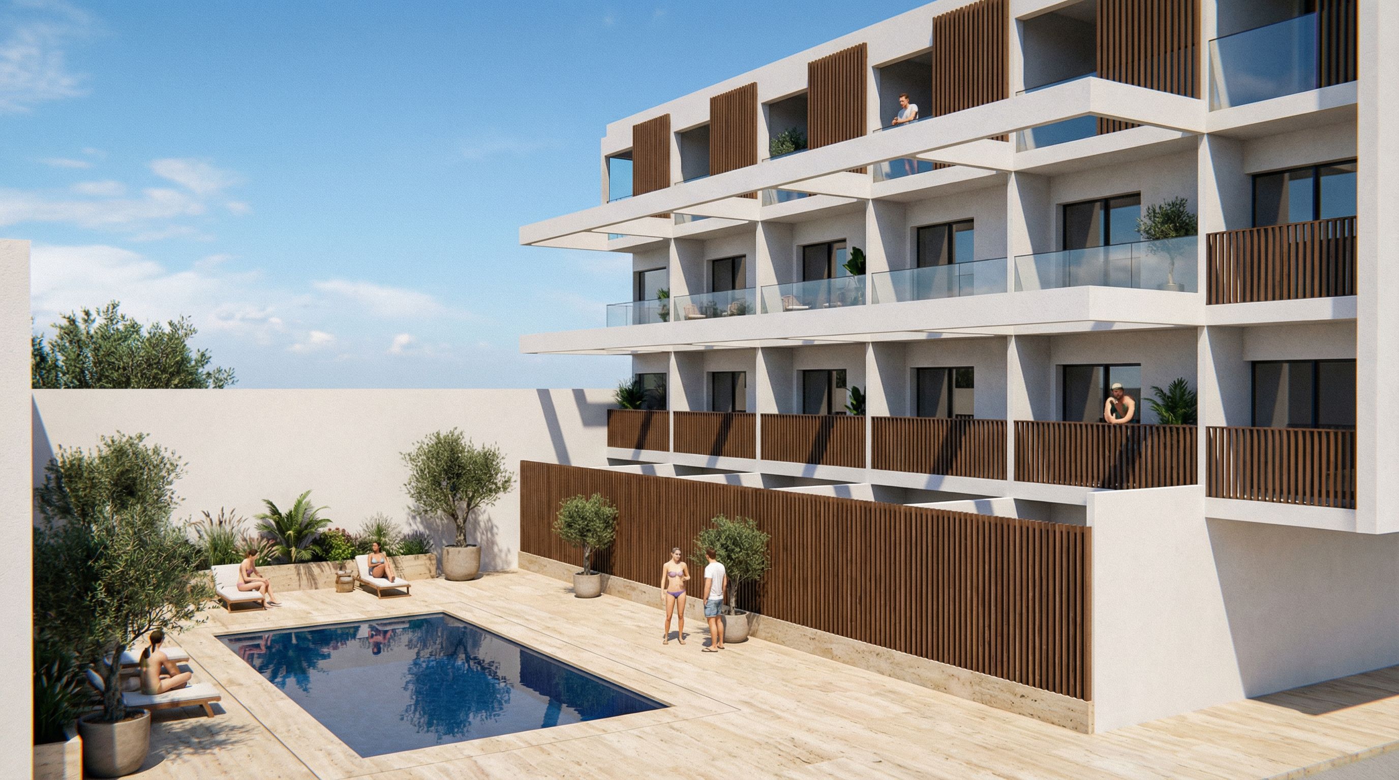 Promptgenera un render realista moderno, RESPETA LA VOLUMETRIA, el volumen blanco, los suelos de travertino y la piscina un color azul profundo, , keep exact camera angle