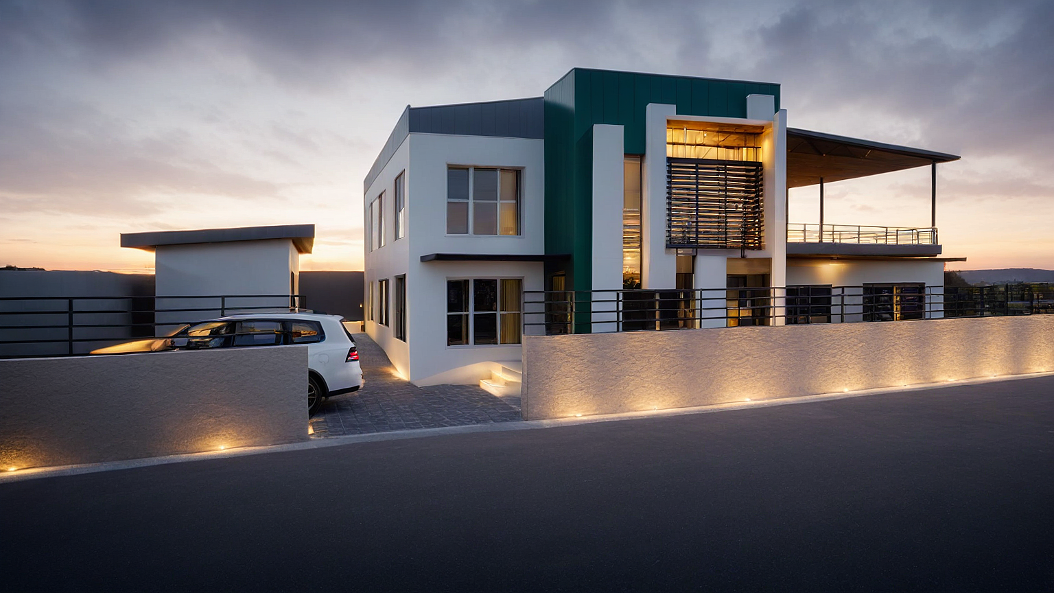 PromptBuilding is a Tech Hub. Maintain existing wall colours, frontal green wall to be aluminium composite panels. Include interior furniture. Interior warm white lights, exterior wall lamps and lights. Few nice cars. Modern sophisticated look. Add trees to rear and sides of property. Road as natural sand. Maintain all colors. Keep the texts as Edfrika Innovation Hub. Make text as it is but emitting warm light. Grey wall in front