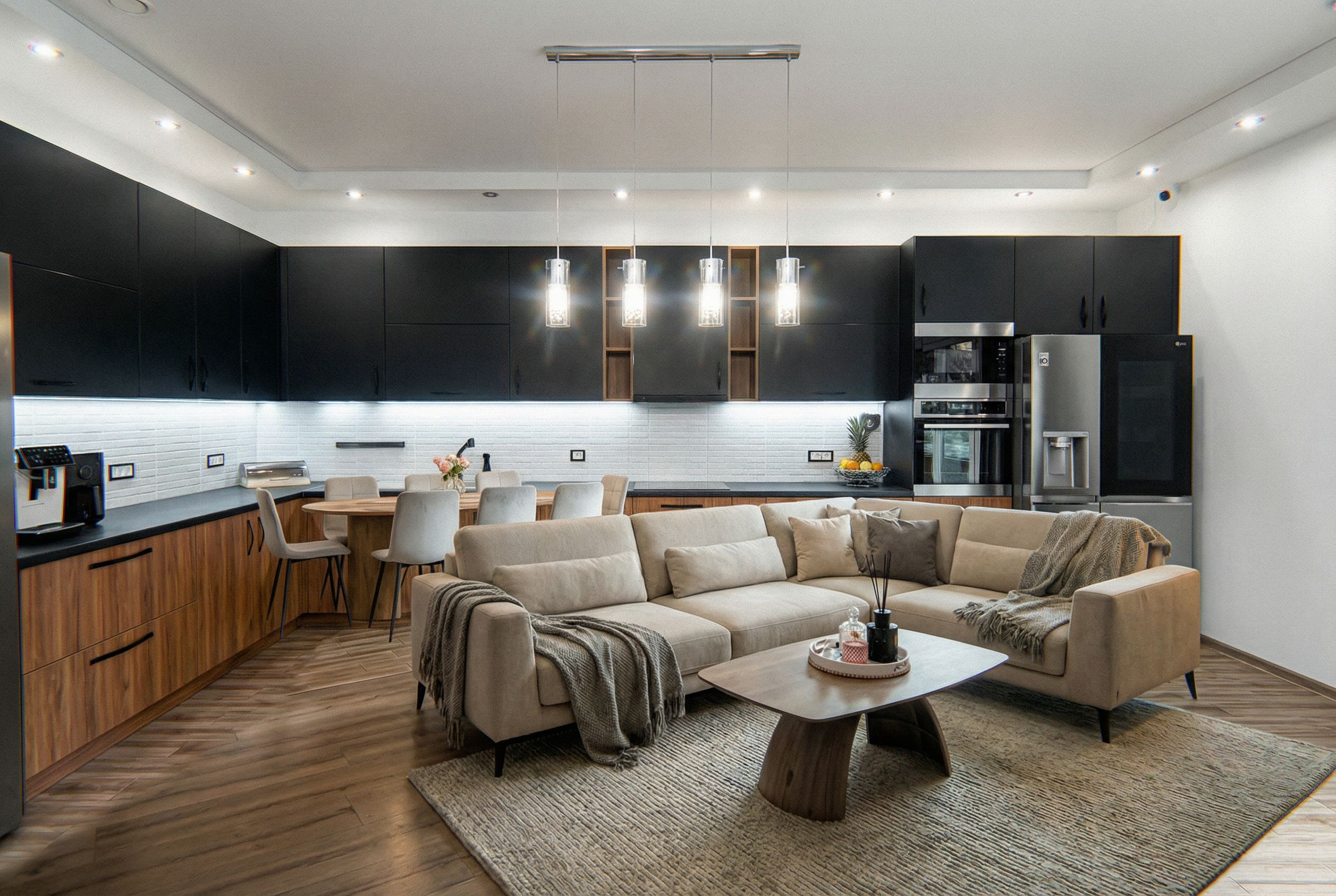 Can you repaint the pink cabinets with paint method, making them matt. Also make walls in color white. Dont change the cabinets placement or add any furniture. Just change the color. Please don't use black color for the cabinets. Match the best wooden color you think will be the one for modern look. Could it be from two different colors like in the reference photo, like uppper cabinets black and down cabinets in wood color., keep exact camera angle