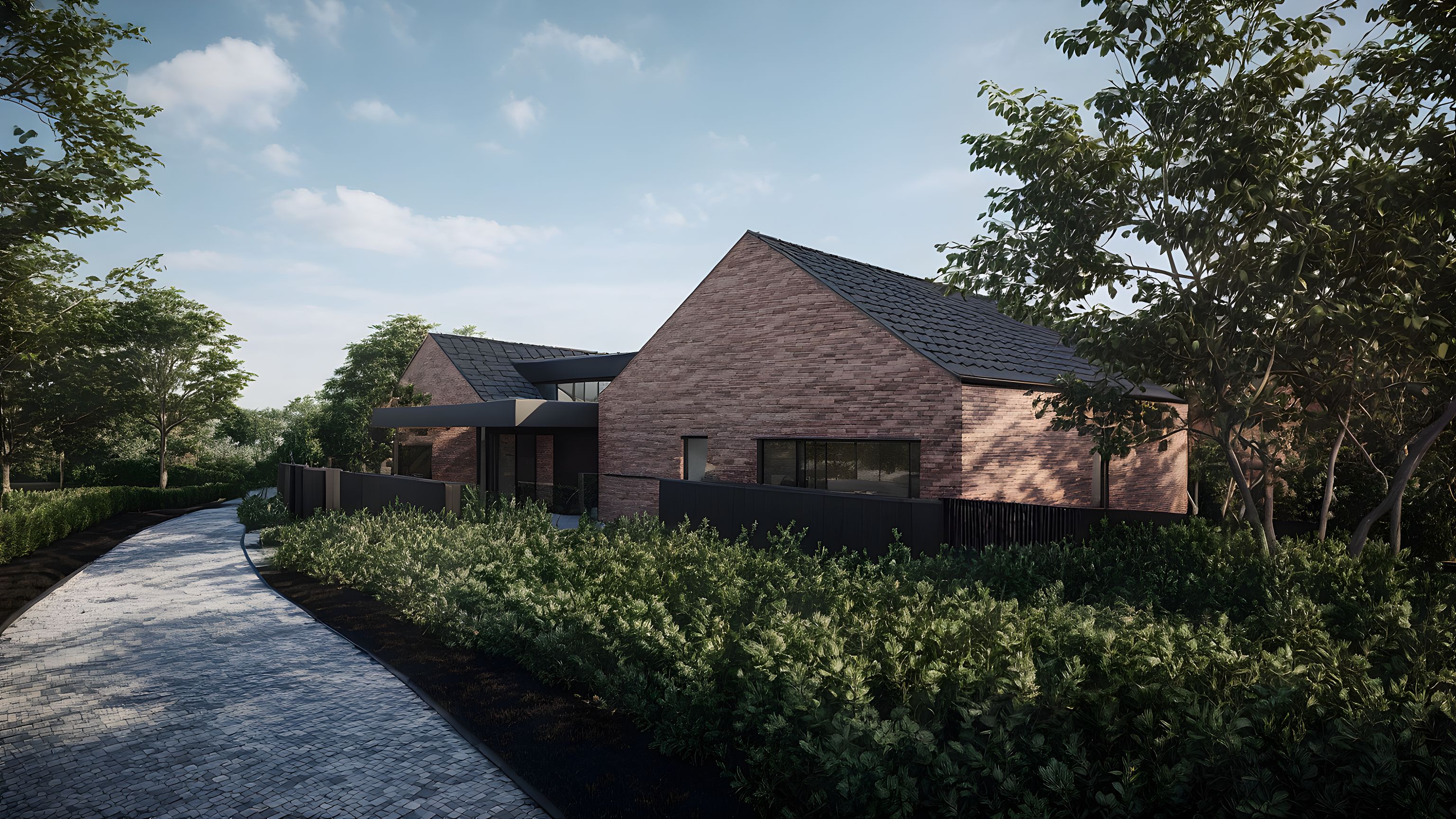Promptvilla modern architecture, expresive daylight, bricks facade, pitched black tile roof,