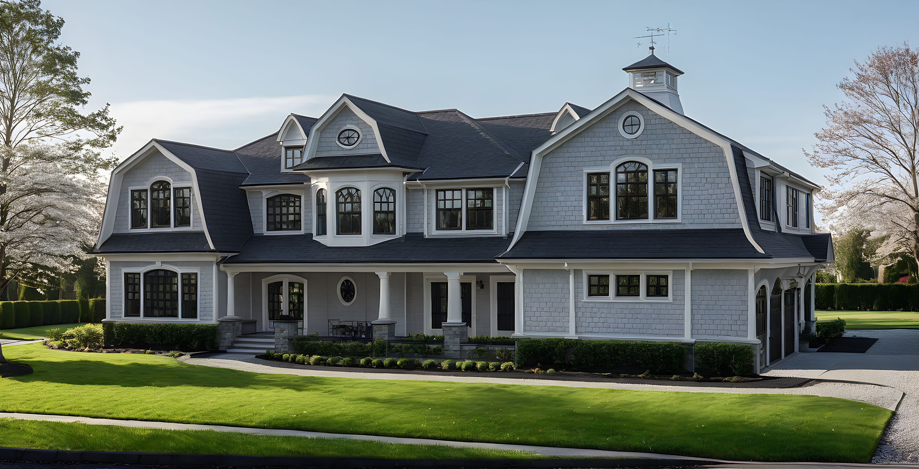 Promptlight grey shingle style black roof lush lawn and landscaping Belgian block driveway white trim and columns cherry tree in lawn white brackets white windows tree canopy