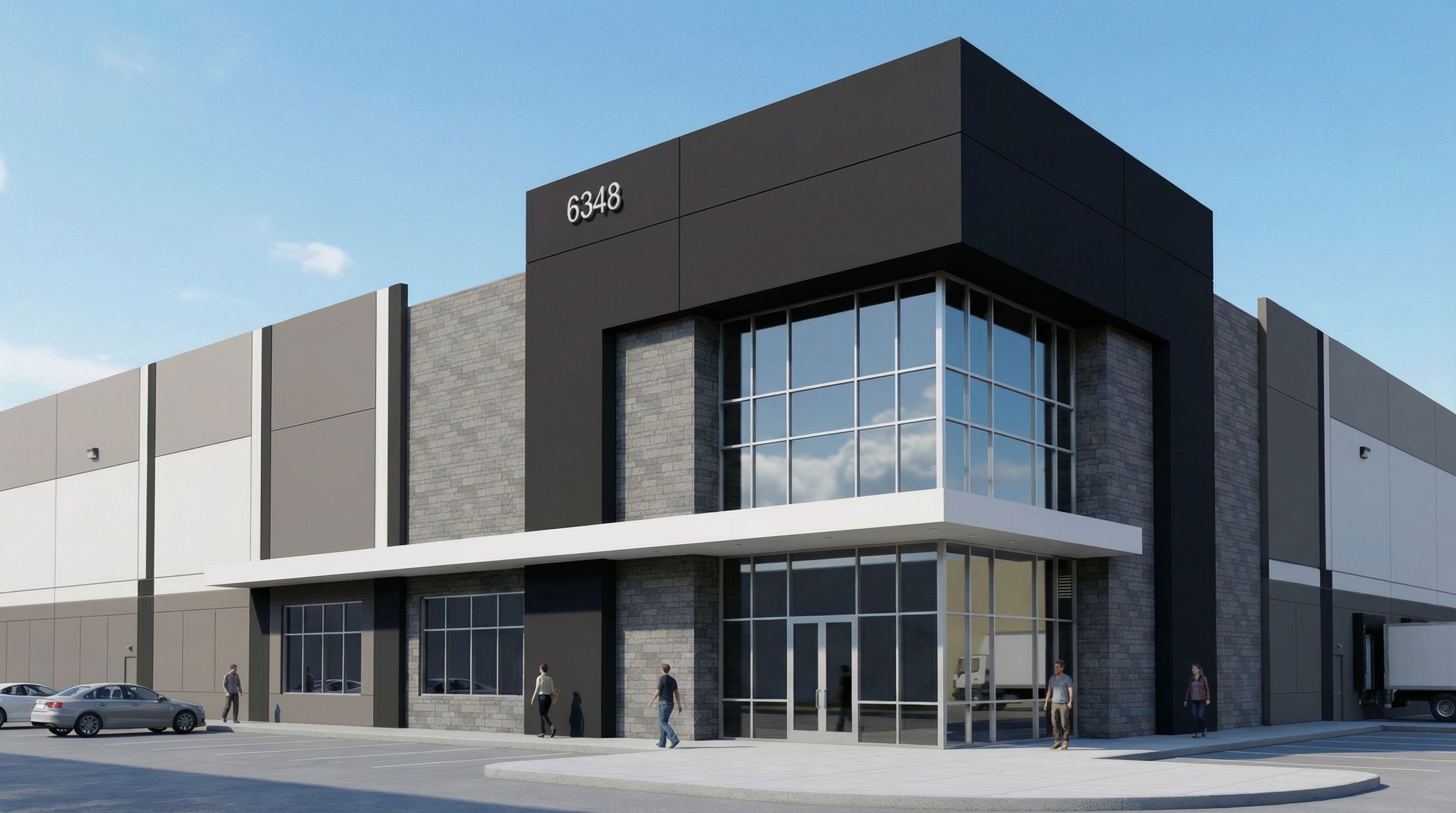 Promptarchitectural exterior rendering, render this photo into photorealistic rendering, make this image look more realistic but don't change any of the architectural elements. Remove the blue tone from the medium paint color. Should be 3 total paint colors. Keep the black and white as is., keep exact camera angle, bright daylight, natural lighting, including people, vehicles, high quality, professional, detailed scene