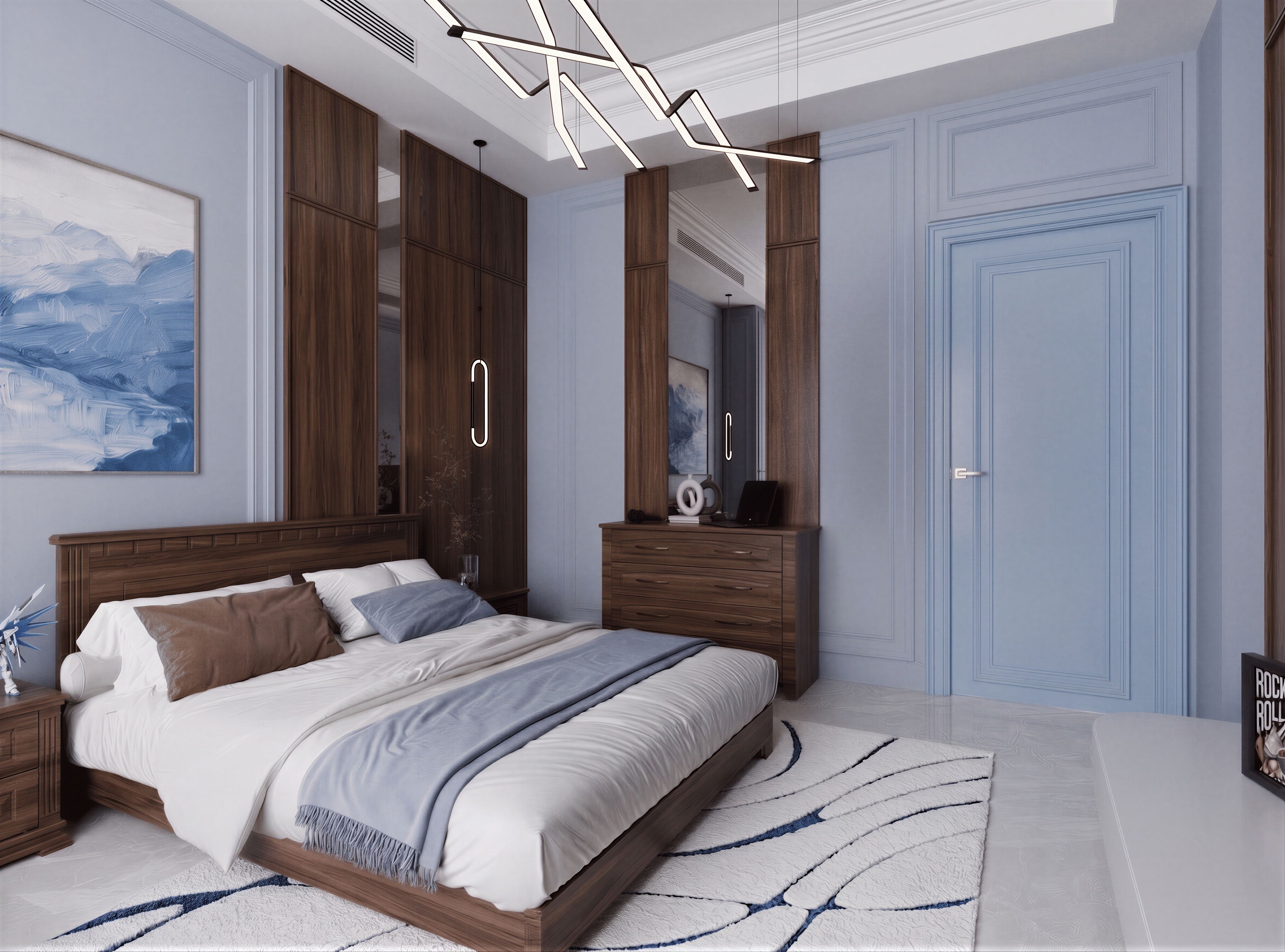 EnhancedPrompt"Edit the provided interior bedroom image by changing only the white door color to match the exact wall color and exact blue tone already present in the image. Keep the same shade, same saturation, same brightness, and same color temperature as the wall. Do not alter the design, materials, lighting, textures, furniture, or any other element. No change in the blue tone at all except applying the same blue to the door. Preserve realism and seamless integration. Ultra realistic render, extremely high quality, ultra detailed, , keep exact camera angle