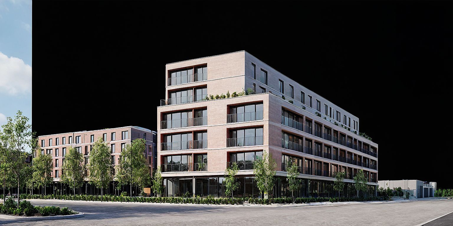 5 over 1 multi-residential building, with commercial retail giant target, on the ground floor. Ground floor should be brick. Building is around 100ft x 330ft in size, On the 5th floor is a roof top garden.. Use Philadelphian materials / colors. Infront of the building is a main road. On the pavements, have some trees surrounding the building. On the left is an existing pitched roof residential building