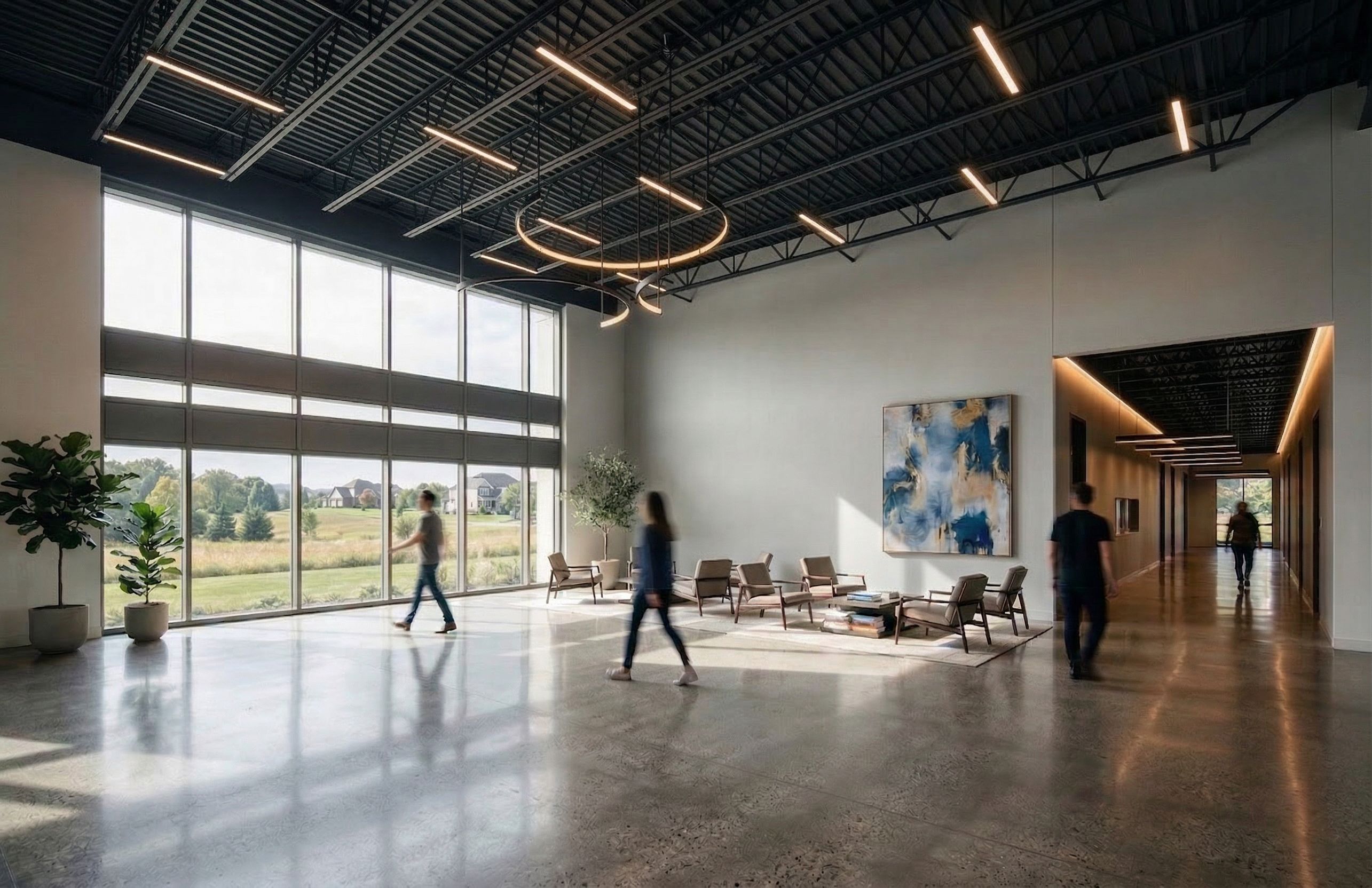 replace the wood ceiling with exposed open web steel joist structure that is painted black. replace the vertical wood on the wall with painted drywall. make no other changes to the image., keep exact camera angle