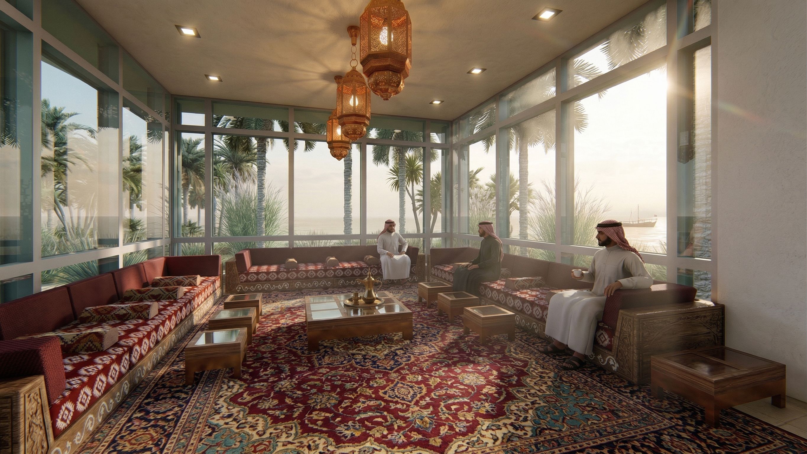 Promptchange the carpet to Persian and add men and spot light in the ceiling, keep exact camera angle