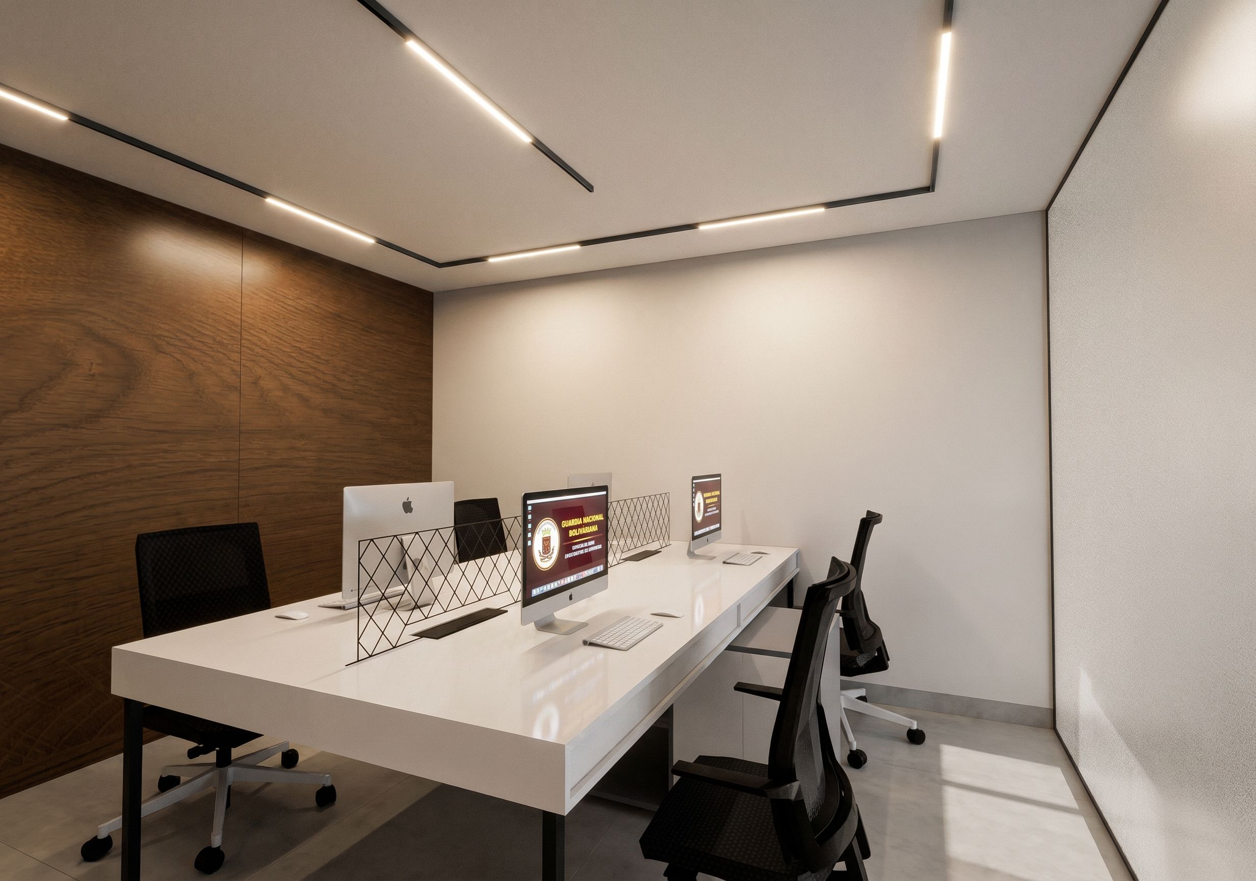 PromptAÑADE EL EFECTO DE LA ILUMINACION Y DE LAS COMPUTADORAS ENCENDIDAS, ES UNA OFICINA DE LA GUARDIA NACIONAL BOLIVARIANA NO CAMBIES NADA NI MODIFIQUES EL COLOR DE LOS MATERIALES NI PISO , keep exact camera angle
