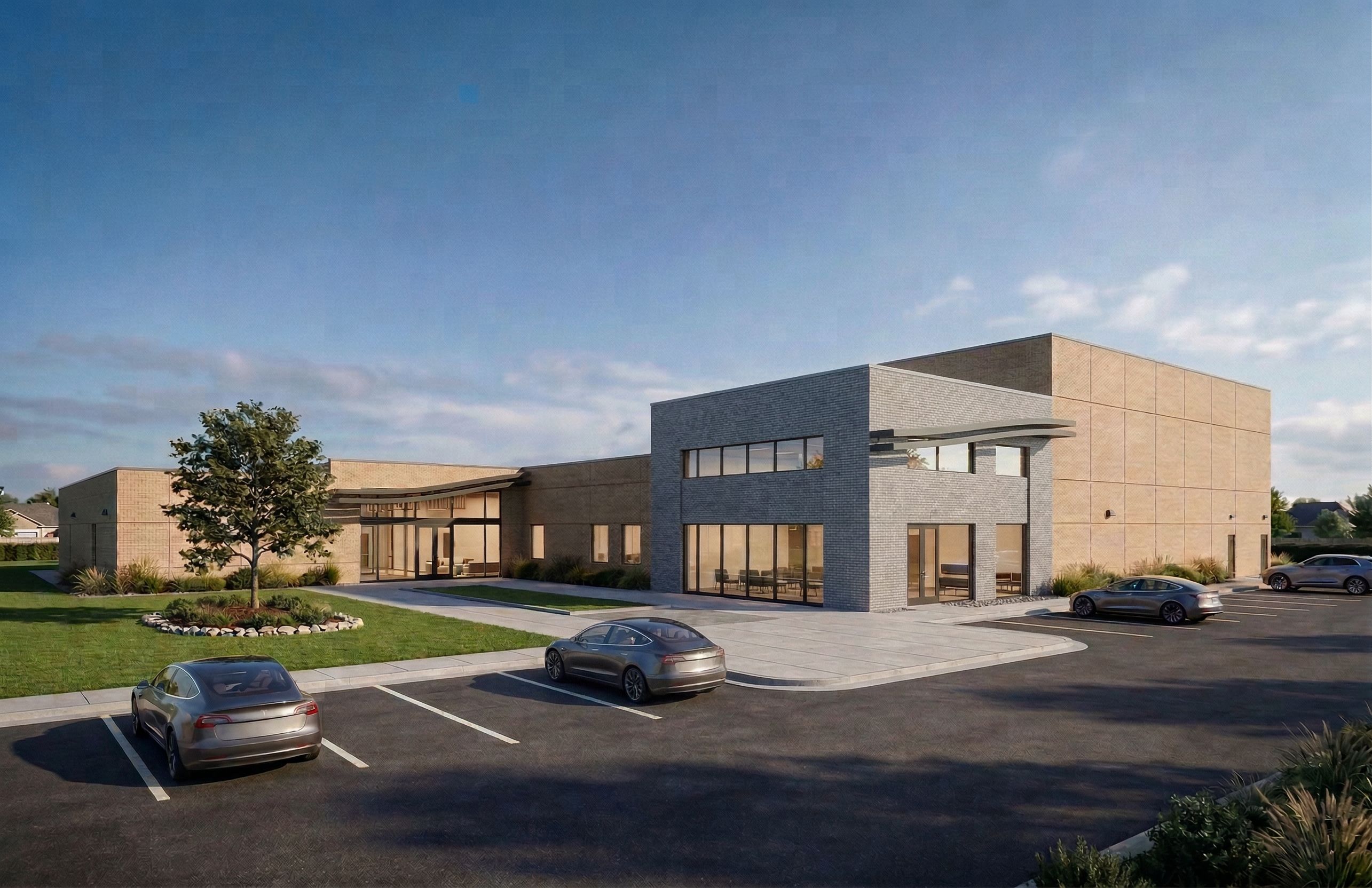 PromptPhoto of a modern commercial Church building, featuring sleek glass, mix of gray brick and natural beige brick facades. Emphasize the mixed materials, textures, and distinctive entryway. Set within a suburban landscape with adjacent parking, clearly defined pathways, and manicured green lawns. Captured in bright daylight, highlighting reflections and shadows on the surfaces. Maintain the perspective and camera angle of the image. In the courtyard area to the left there should be a plant bed with a singular oak tree, keep exact camera angle, keep exact camera angle