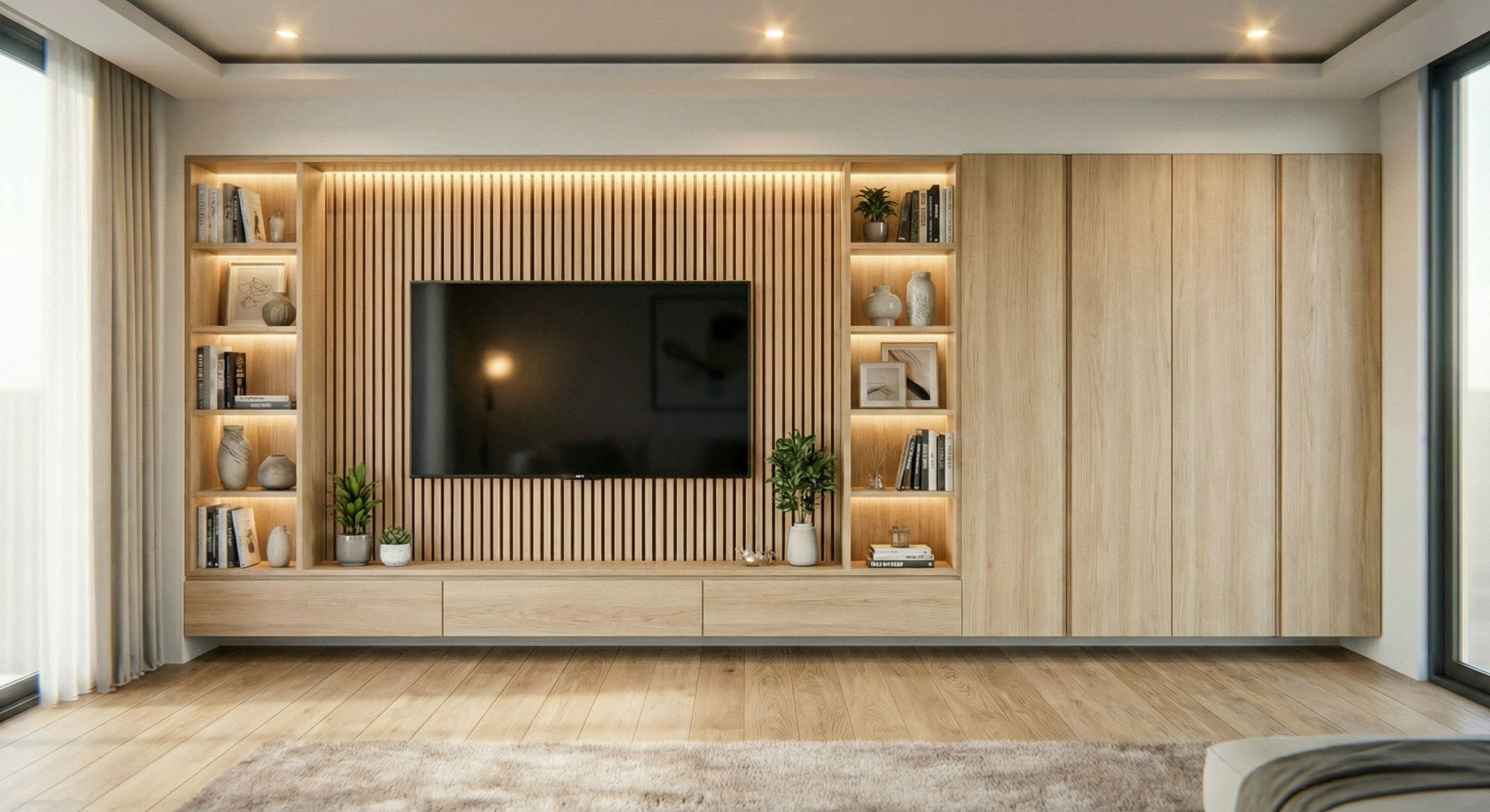 Promptelimina el armario de puertas del lado derecho. utiliza un estilo más moderno con maderas claras y no tan rústico una vez eliminado el armario, añade un armario de 6 puertas separado del otro mueble por 70centímetros y pon pladur en todo el alrededor de los muebles como se ve el el dibujo y que ninguno de los muebles toquen el suelo., keep exact camera angle
