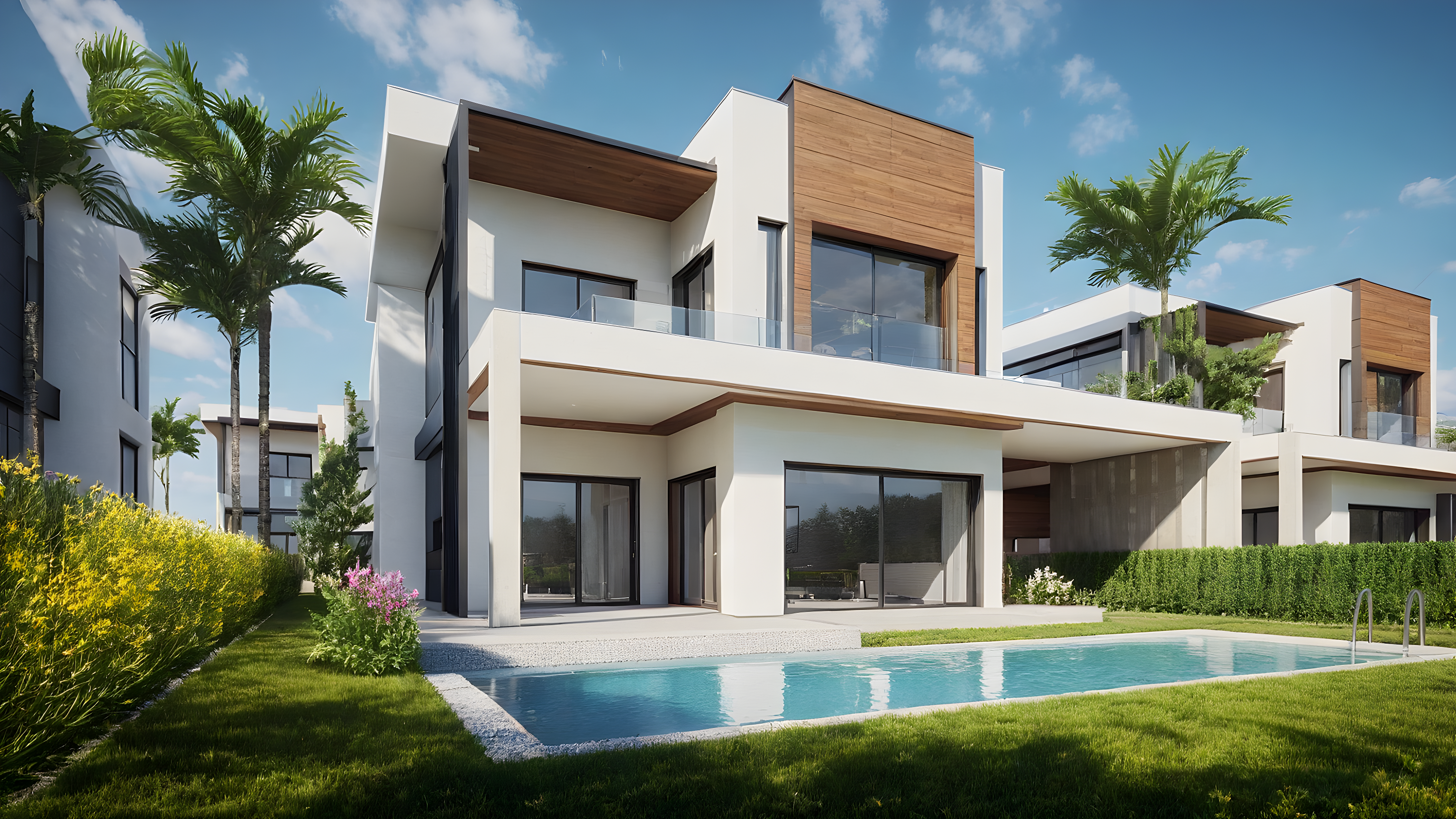 PromptSunny day. More vegetation and flowers in garden. Grass garden. Nice realistic pool. Building colors stay same. Building materials stay same. Shiny glasses. More trees.