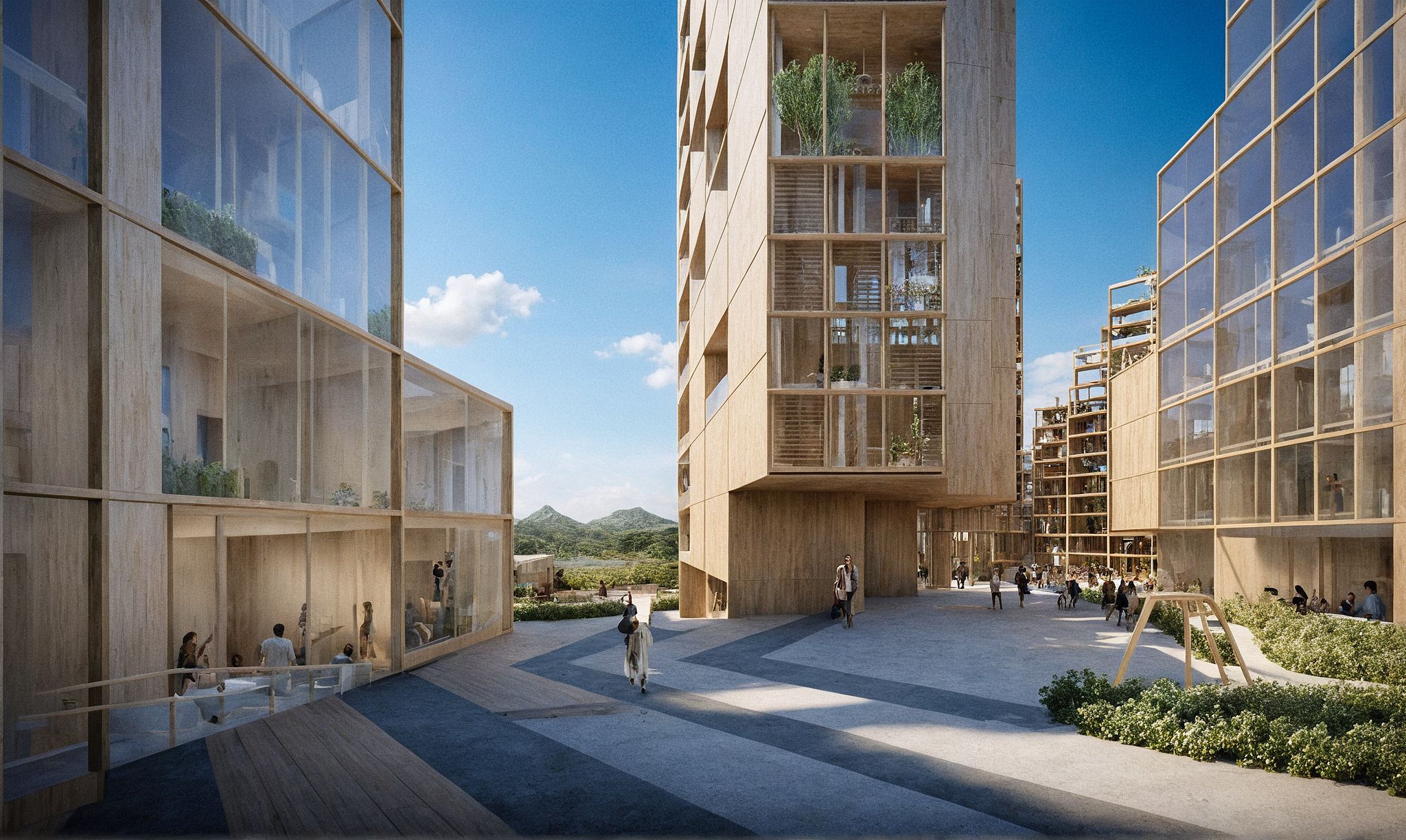 PromptA modular residential complex organized around a large central courtyard. The architecture is defined by a structural grid of exposed timber beams and columns, with transparent glass walls and open balconies. Multiple levels of walkways, terraces, and staircases create visual permeability and social interaction. The courtyard is filled with greenery, communal furniture, and people gathering, working, and socializing, evoking a sense of community and openness. The design emphasizes sustainable materials, biophilic principles, and human-centered living. Photorealistic render, natural daylight, high detail, architectural visualization style.