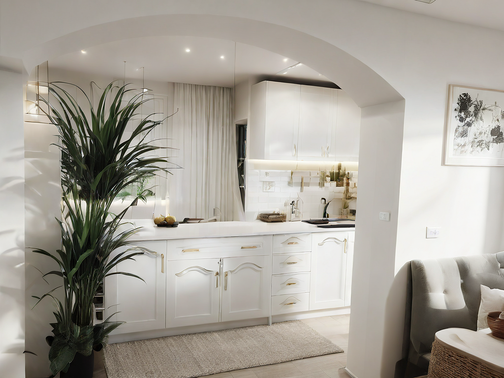 Promptmake a modern minimalist kitchen with white matt doors, keep the courtains at the same position, keep the arc where it is, use led lightings on the ceiling.