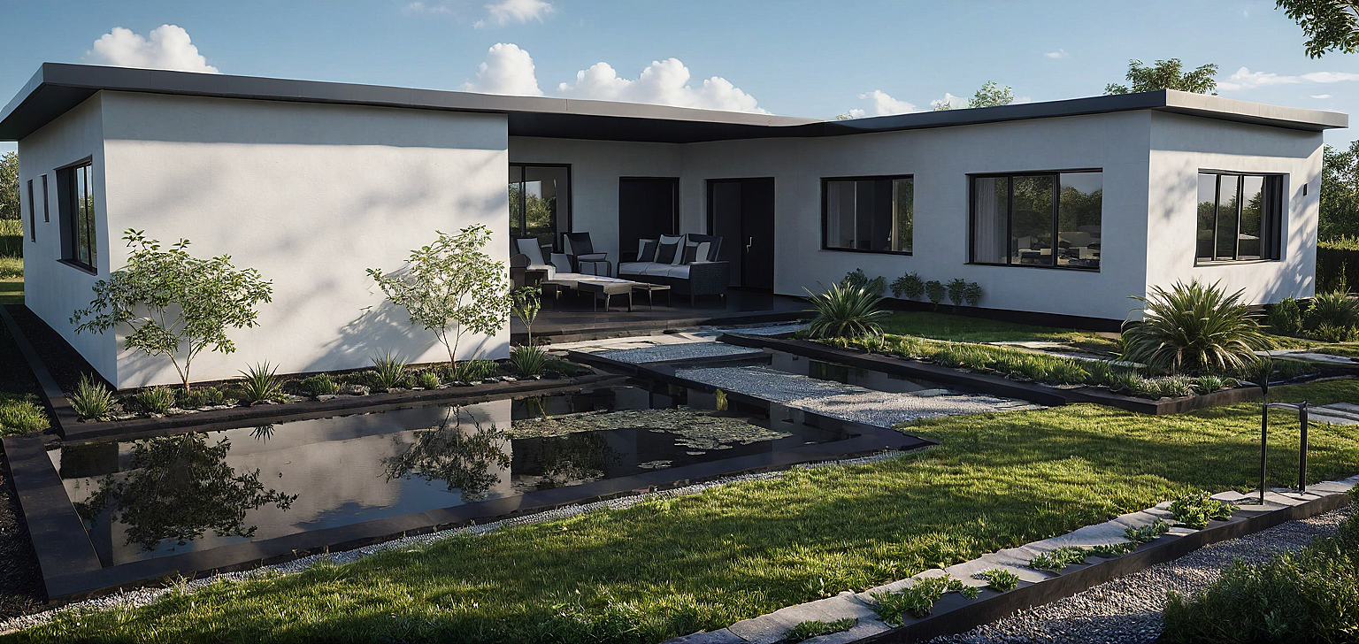 modern black house with garden
