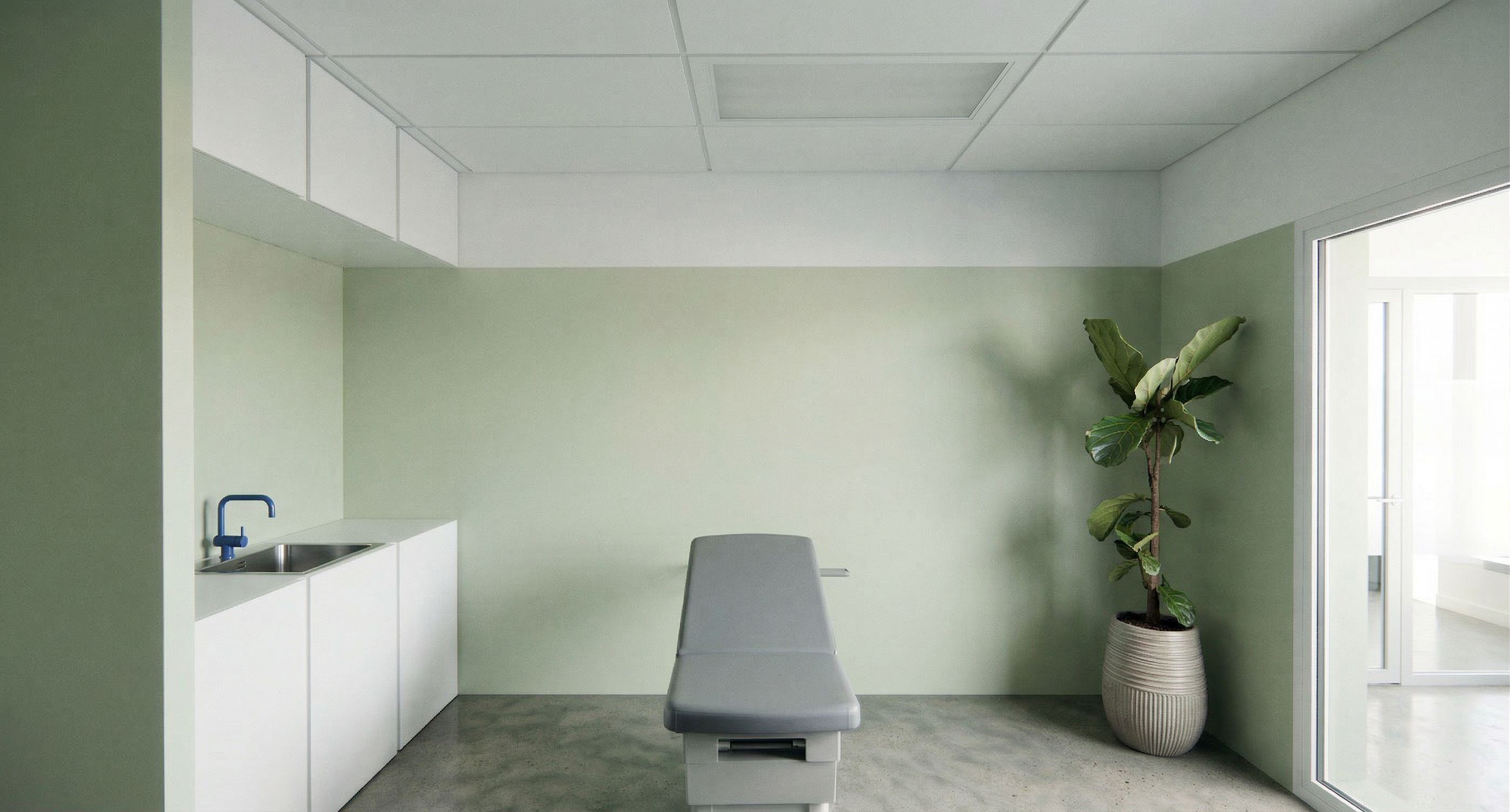 keep the composition, keep the positon of each material and color, make the following changes 1: replace the black walls by the same green than on the wall in the center 2 : make the floor mat polished concrete, keep exact camera angle