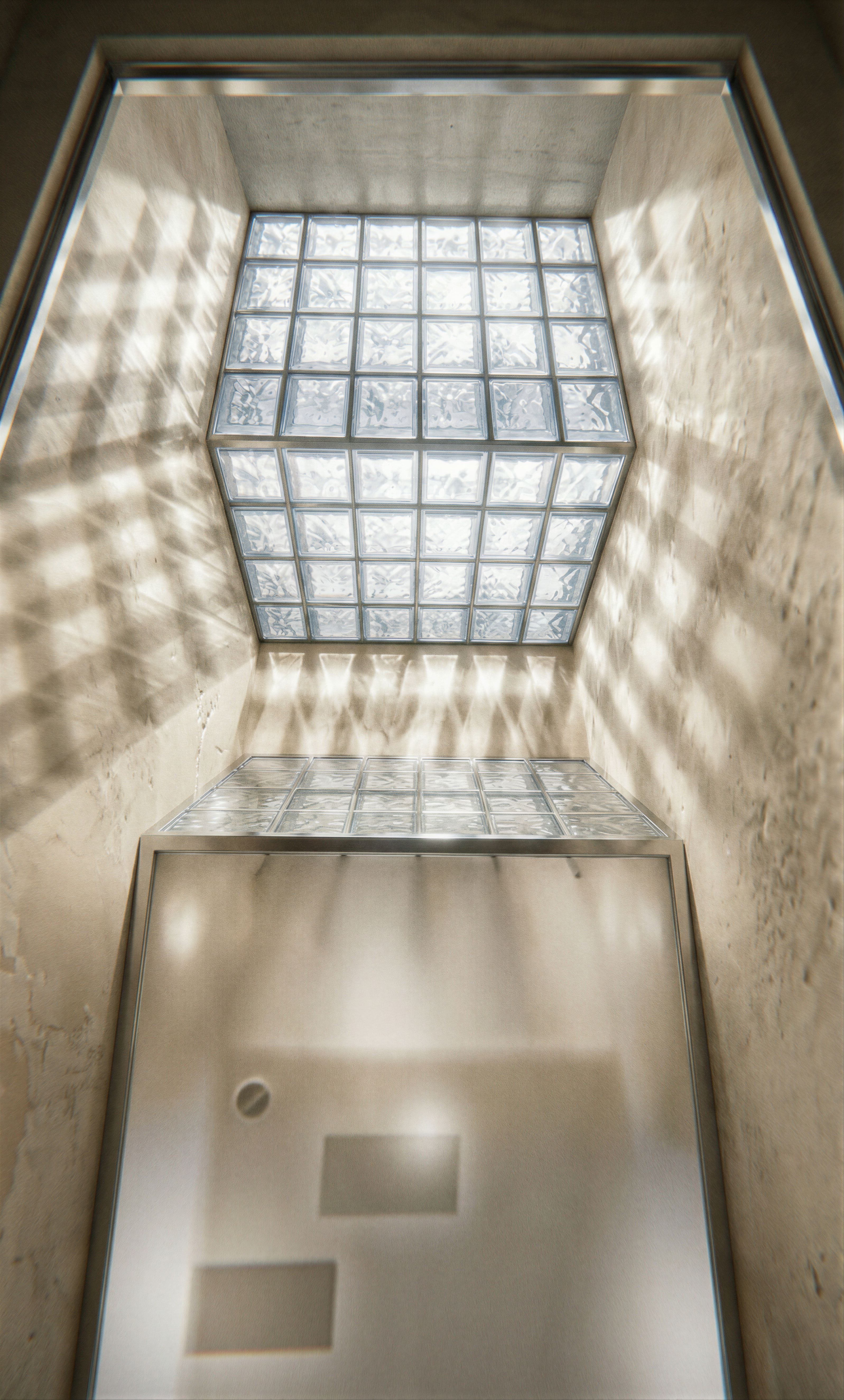 EnhancedPromptPhoto of a contemporary building interior featuring a geometric glass block ceiling, emphasizing the interplay of light, shadow, and texture. Architectural design elements include sleek, polished surfaces and clean lines. The urban setting highlights minimalist surroundings, with muted wall finishes enhancing the focus on the ceiling. Natural light filters through the glass, creating soft reflections and dynamic shadows. Captured from a low angle, the perspective accentuates the height and symmetry of the space, ideally envisioned with a wide-angle lens for a grand, immersive feel., keep exact camera angle