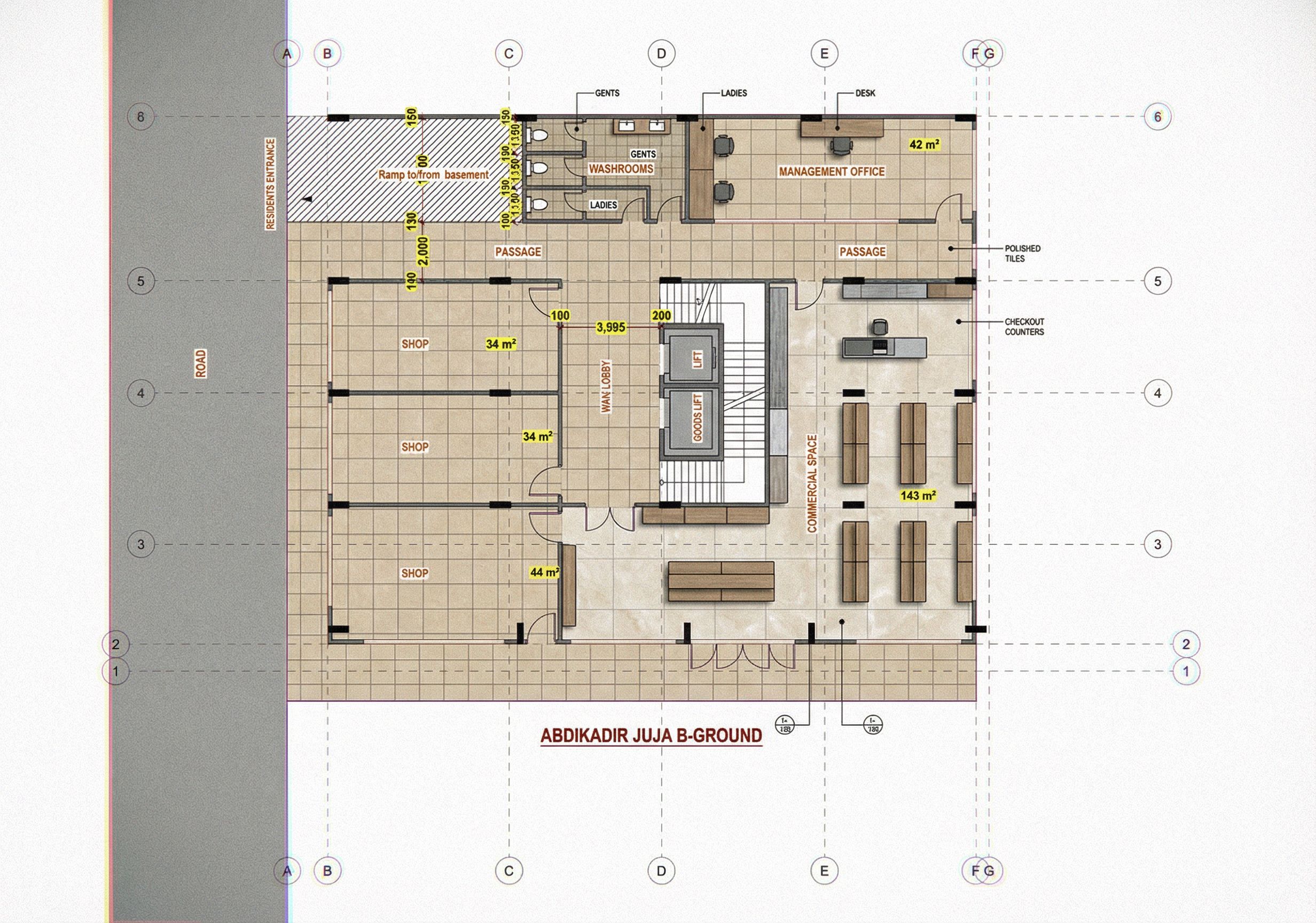 Promptlayout showing GROUND FLOOR OF A BUILDING with partitions and internal measurements clearly defined. use ceramic tiles on the floor finishes. MAKE LAYOUT IMAGE HIGH RESOLUTION AND REALISTIC. IMAGE SHOULD BE REALISTIC AND TWO DIMENSIONAL AND CLEARLY DEFINE THE WASH ROOMS. INCLUDE SHOPS AT THE FRONT WITH A LIFT LOBBY AT THE BACK, WASHROOMS AND THE COMMERCIAL AREA AS A SUPERMARKET. INDICATE THE VEHICULAR RAMP TO THE BASEMENT., keep exact camera angle