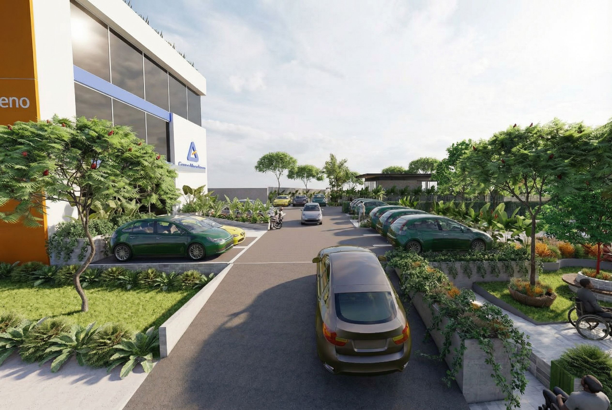 architectural exterior rendering, render this photo into photorealistic rendering, keep the original structure, forms and shapes and materials of the photo. And only improve lighting, shadows, and realism. , keep exact camera angle, including people, vehicles, greenery and vegetation, trees, high quality, professional, detailed scene
