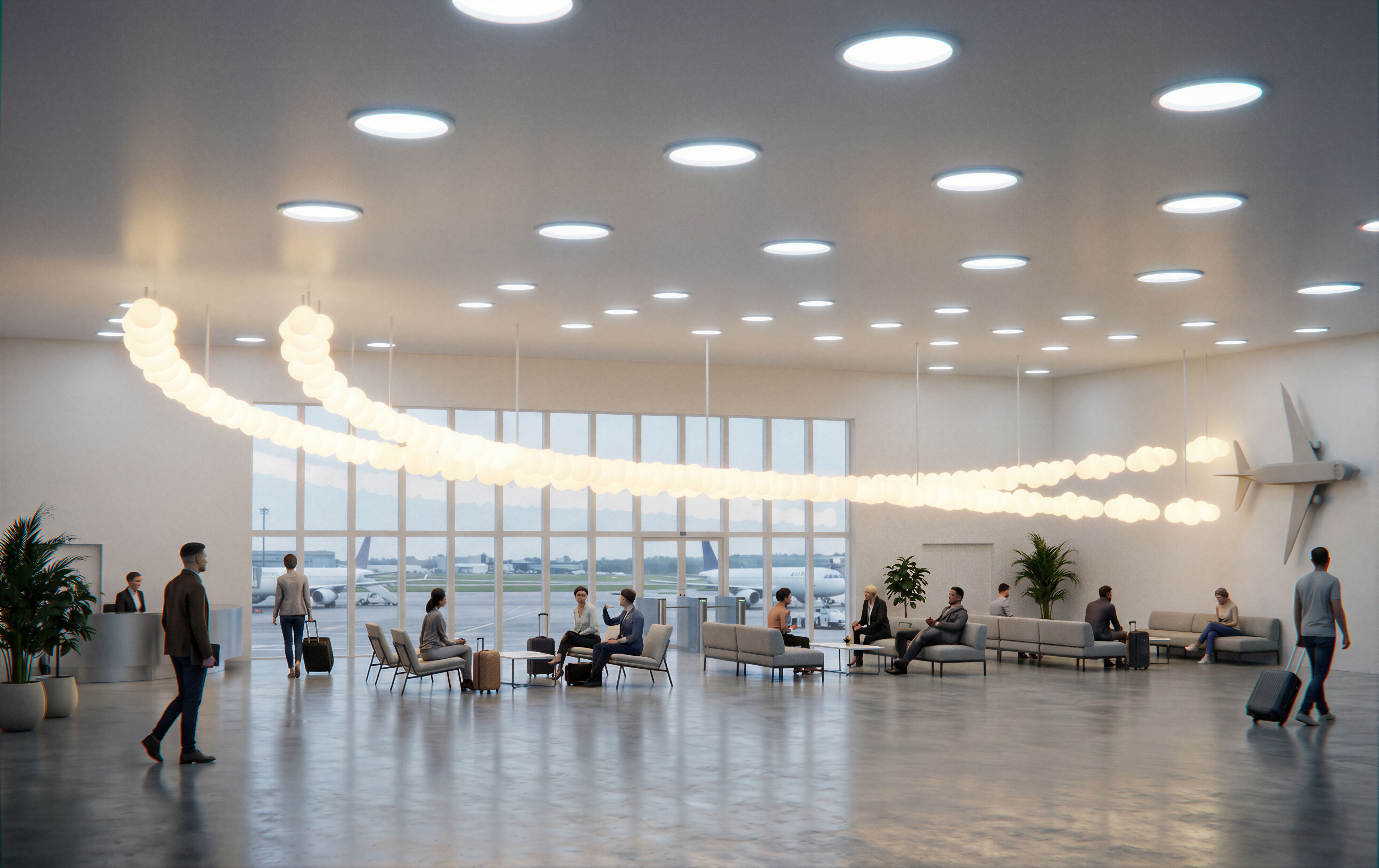 EnhancedPromptInterior perspective of an airport gate lounge seen in long section. Minimal, monochromatic architecture with a low, smooth white ceiling and a deep rectangular space. A sculptural glowing contrail light fixture made of many soft, cloud‑like luminous spheres sweeps in a graceful parabolic curve from the left foreground across the room to the right, where it connects to a sleek, abstract wall‑mounted airplane. The contrail emits a warm white light and appears volumetric and soft, with subtle bloom. In the ceiling, a regular grid of large 2‑foot diameter recessed round LED downlights provides a secondary, cooler white ambient layer. At the far side, a tall window wall with vertical mullions suggests the airfield beyond, while a simple gate counter and minimal walls keep the composition clean and modern. Camera is placed at eye level, looking across the entire length of the space, with realistic global illumination, soft shadows, and slightly cinematic contrast. High‑resolution, physically based rendering, no people, calm atmospheric mood. Lot of furniture., keep exact camera angle