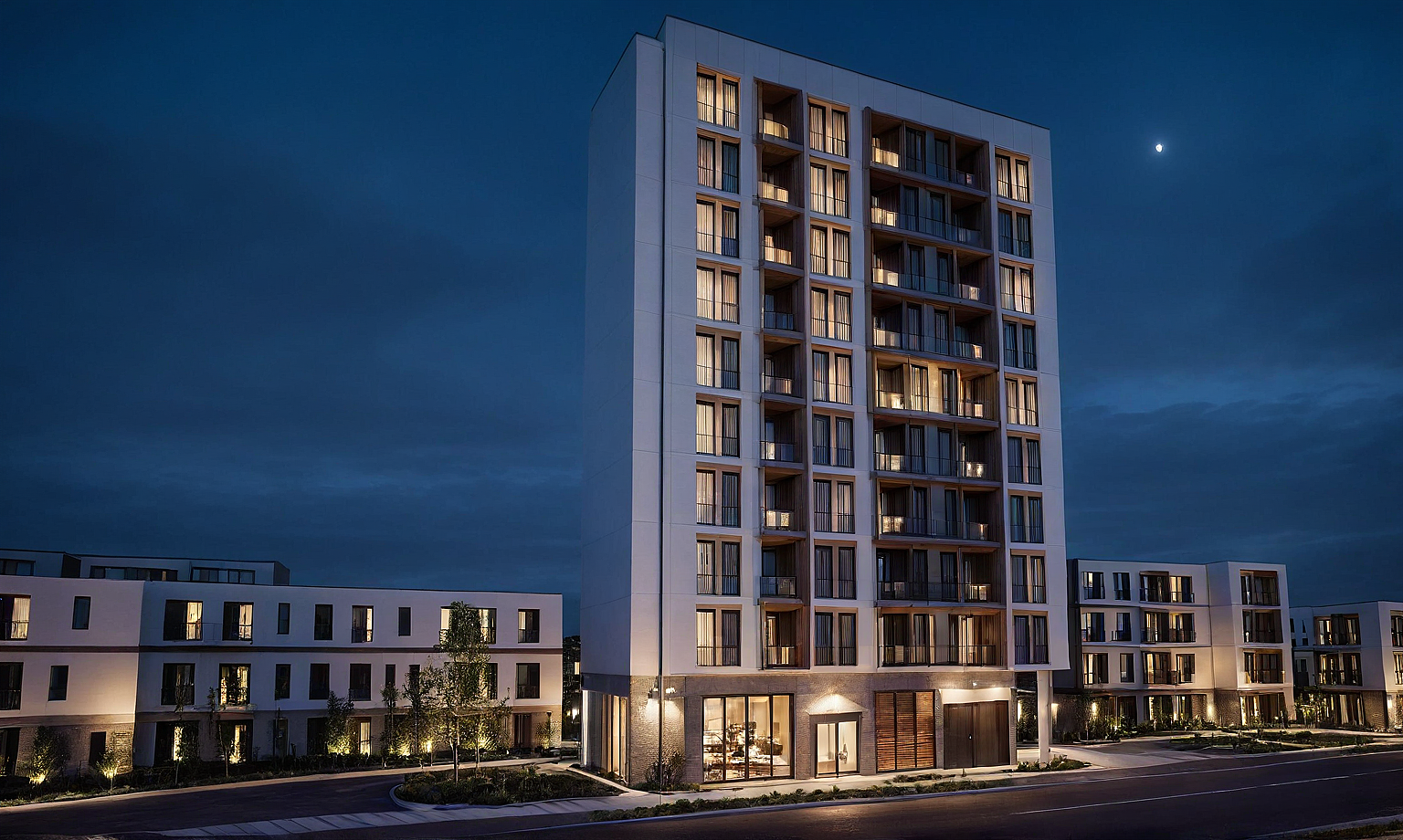 luxury apartments, modern architecture, urban landscape, window T elements, lodges, parking entrance gate, night atmosphere, pedestrian walking, habitants in the building