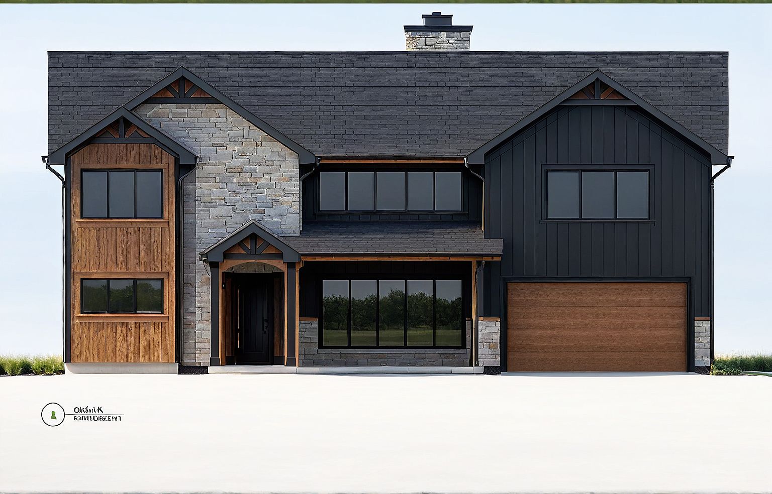 PromptBlack Hardie Board and Batten Siding; Black Columns, Trim and Corner Boards, Stained Oak Door; Bay with Medium Stained Oak Vertical Board and Batten Siding on Bay w. Oak Trim; Medium Stained Oak Horizontal Garage Door; Medium Stained Oak Brackets; Rough Ashlar Limestone; Grass Front Yard