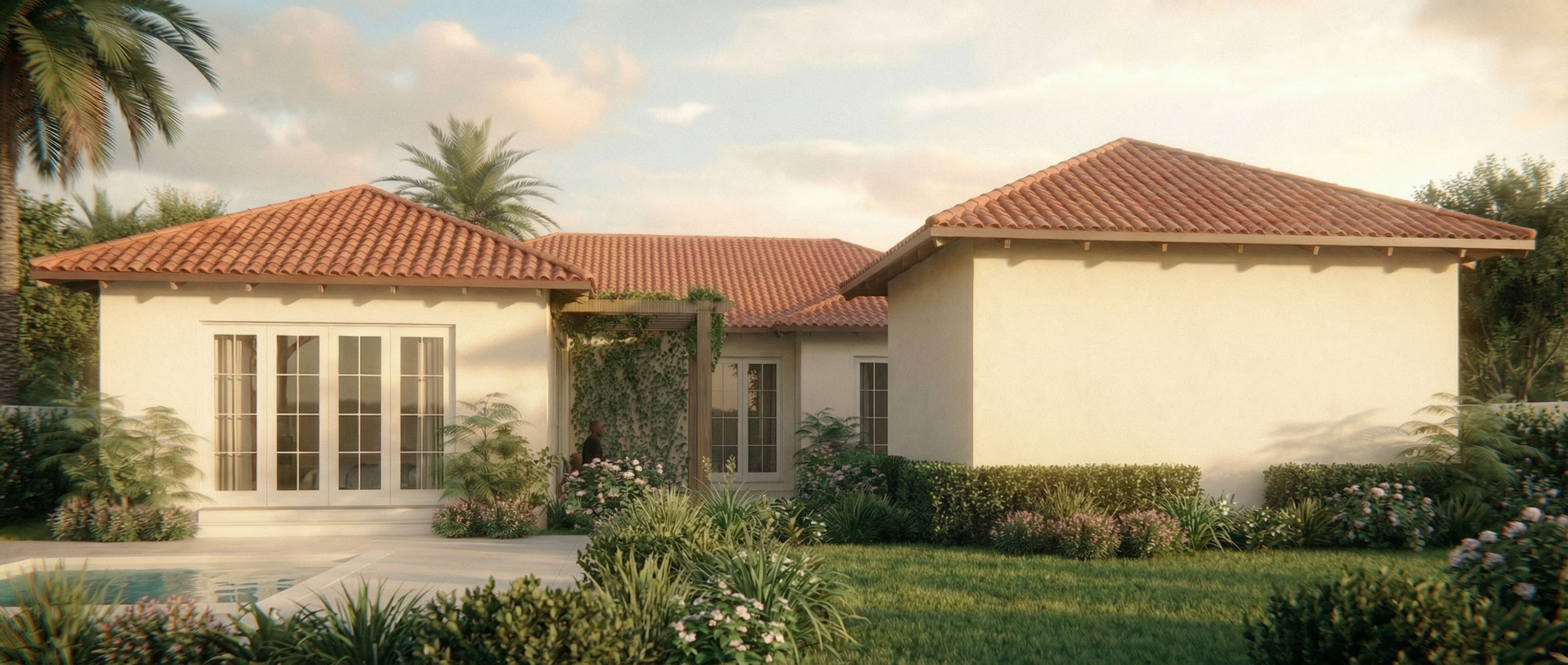 Promptkeep everything the same change only what i tell you, the cabana wall that is facing the camera, that is just a blank wall with no door or window. the cabana is the unattached structure on the right of the image.