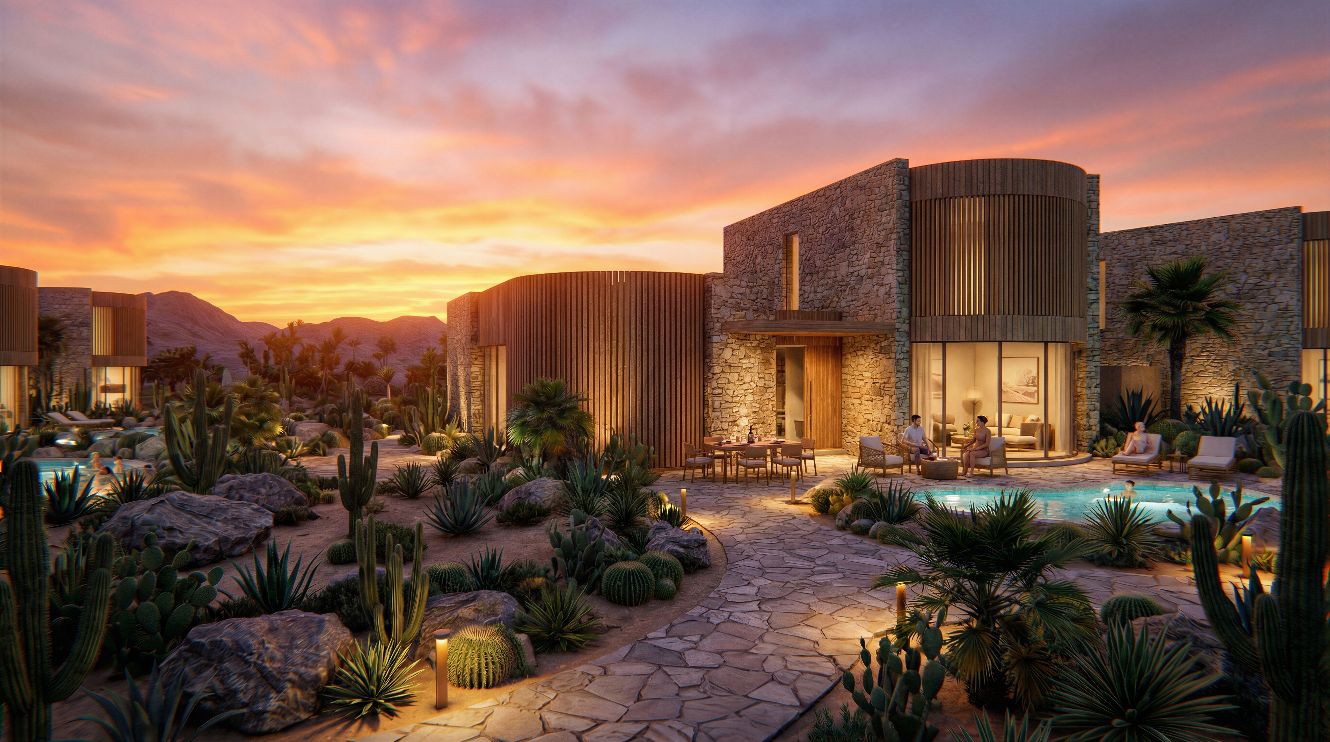 Render One of the bungalows by itself with modern desert landscaping, patio with outdoor dining and private pool at Sunset.