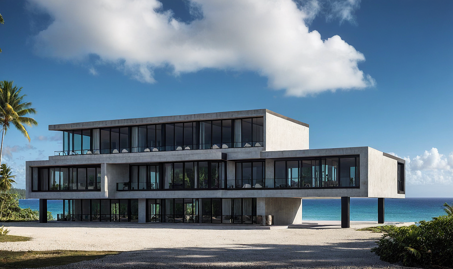 PromptModern black concrete building nestled between the mountains and the beach in Las Terrenas, SamanĂ¡, Dominican Republic. Surrounded by lush coconut trees, the design features black window profiles and a sleek aesthetic. The ground floor includes black-framed glass panels with curtains behind the windows, blending privacy and style. Set in the serene afternoon light, this architectural marvel harmonizes with the tropical landscape and ocean views