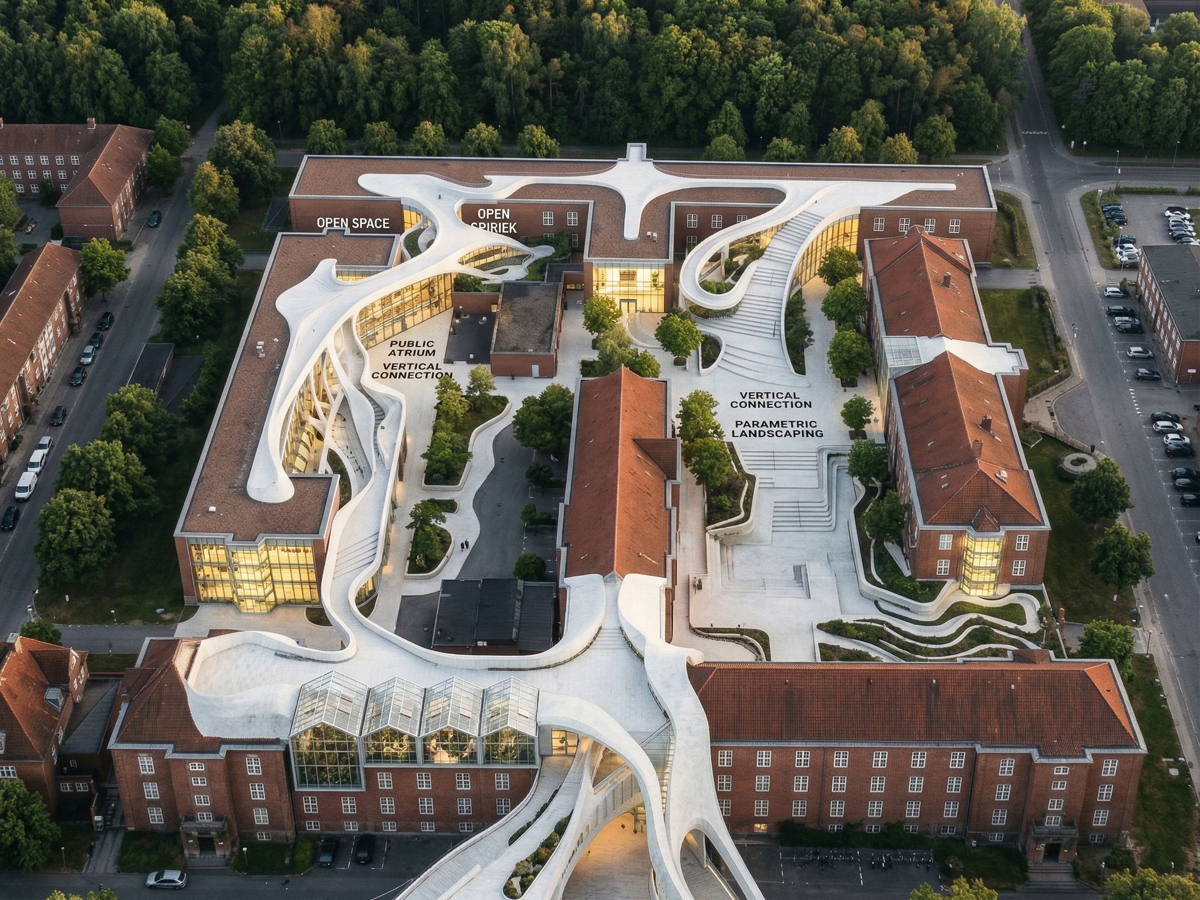 Reuse this image and create some variation. All The roofs of the straight buildings should be the same as those in the reference image 1; "only" in the building at the top of the image, where the curved white stone lines intersect the building, should large glass atriums be opened, similar to the windows already created and illuminated for the other buildings. Insert small plants ergonomically along the white stone plan. Create some rooftop greenhouses that look like panoramic glass volumes in the building at the bottom of the main image., keep exact camera angle