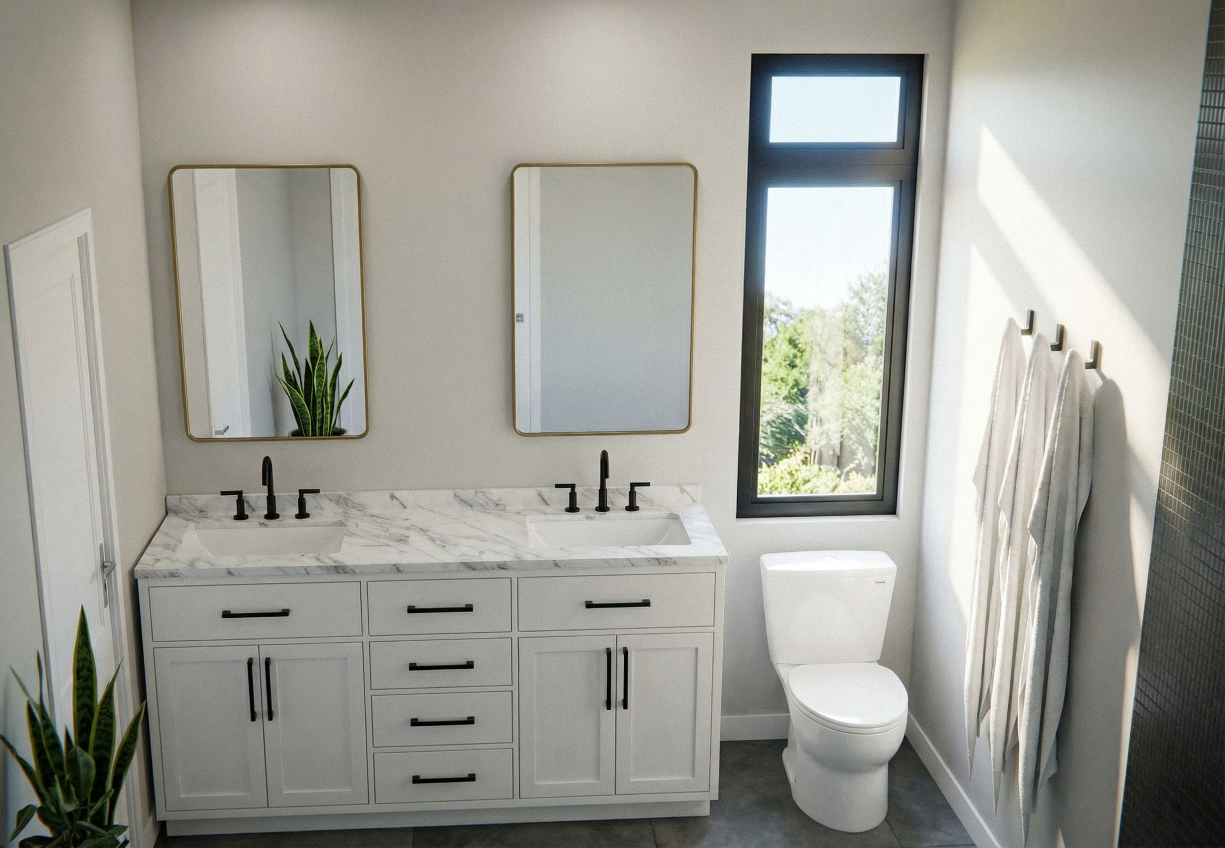 PromptPhoto of a modern bathroom space featuring dual sinks, sleek cabinetry, and minimalist decor. Highlight the elegant marble countertop, black fixtures, and abundant natural light filtering through large, panoramic windows. The setting includes accessories like hanging towels and greenery, enhancing the design's freshness. Capture a top-down perspective with a focus on the layout dynamics, showcasing textures from the floors to the cabinetry. The ambient lighting creates soft shadows, accentuating the clean lines and contemporary aesthetics of this intimate inner space., keep exact camera angle