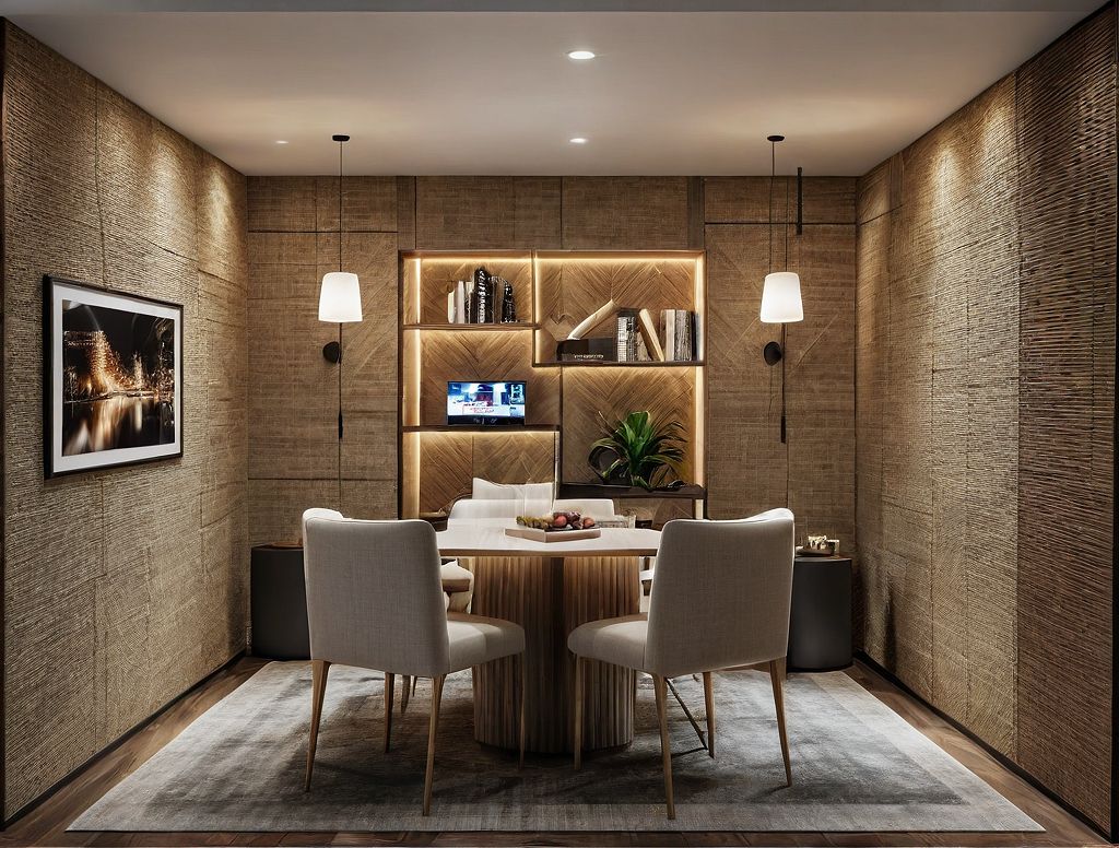 PromptCreate a rendering based on the image that includes a game area with linen grass cloth on the wall walls