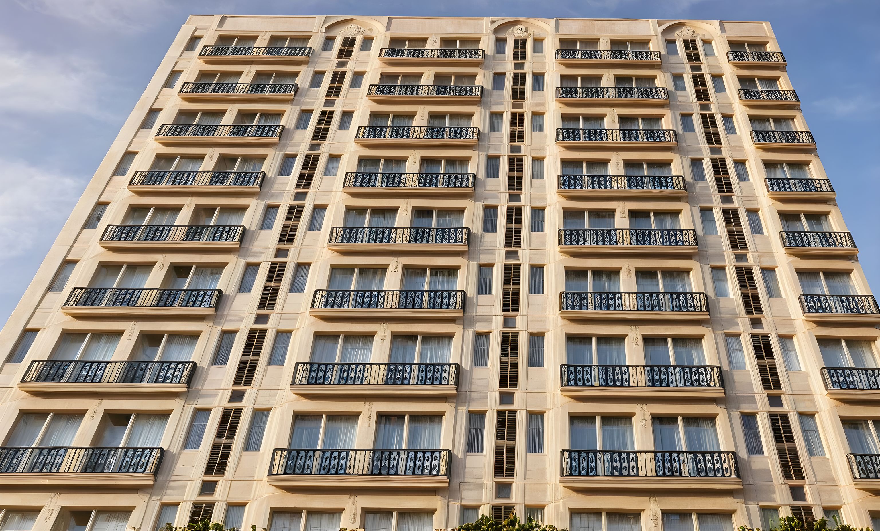 PromptPhoto of a high-rise residential building featuring intricate facade details, large glass windows, and decorative balconies adorned with greenery. Surrounded by a vibrant urban landscape, with nearby structures reflecting a modern city environment. Captured during golden hour, natural sunlight casts soft shadows and highlights across the building’s exterior. Perspective from a low angle, creating an imposing view, with a wide-angle lens to showcase the structure's height and architectural complexity.
