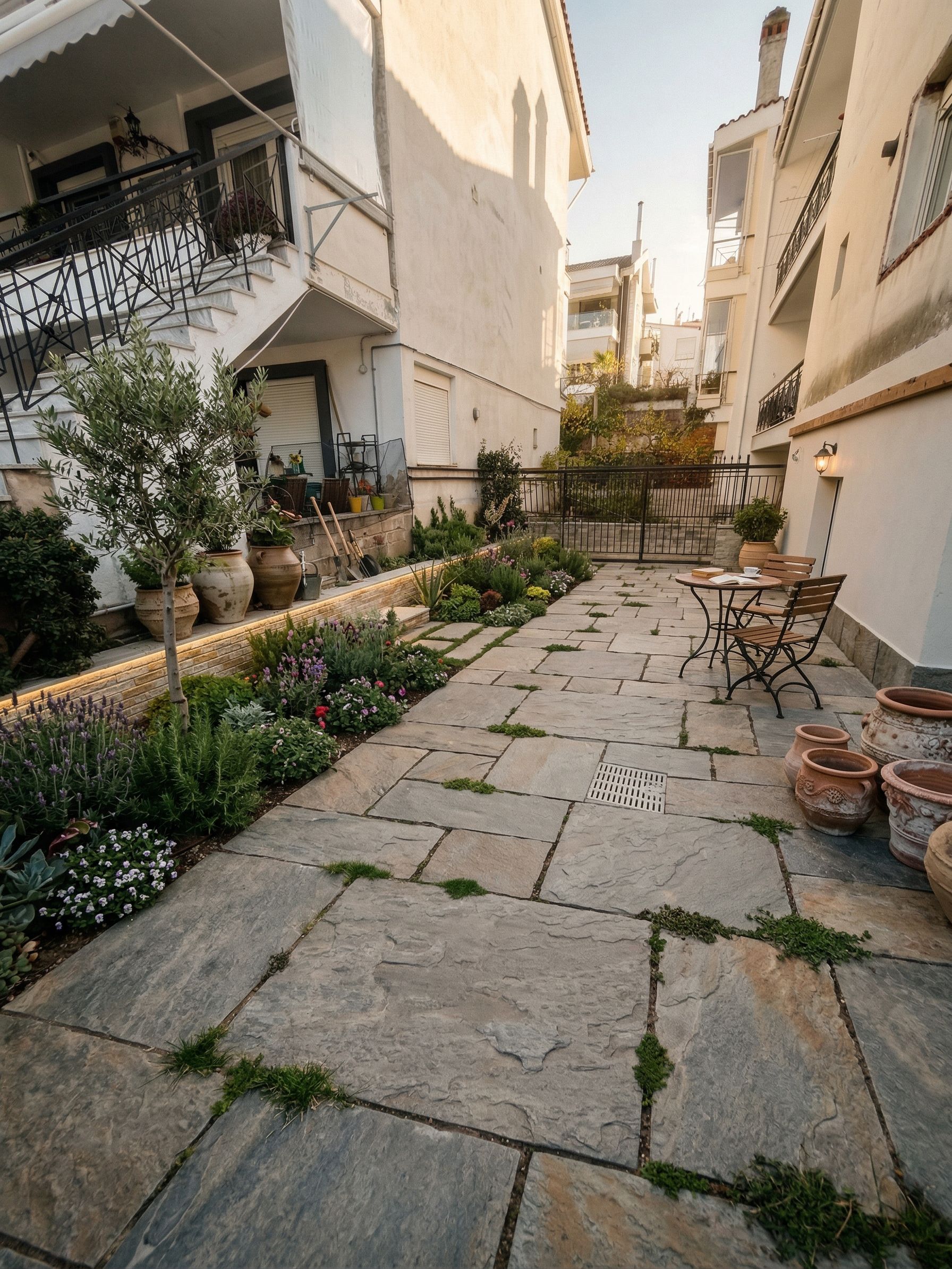 create a beautiful exterior garden with furniture and a little grass. , keep exact camera angle , put stone to the concrete, keep exact camera angle