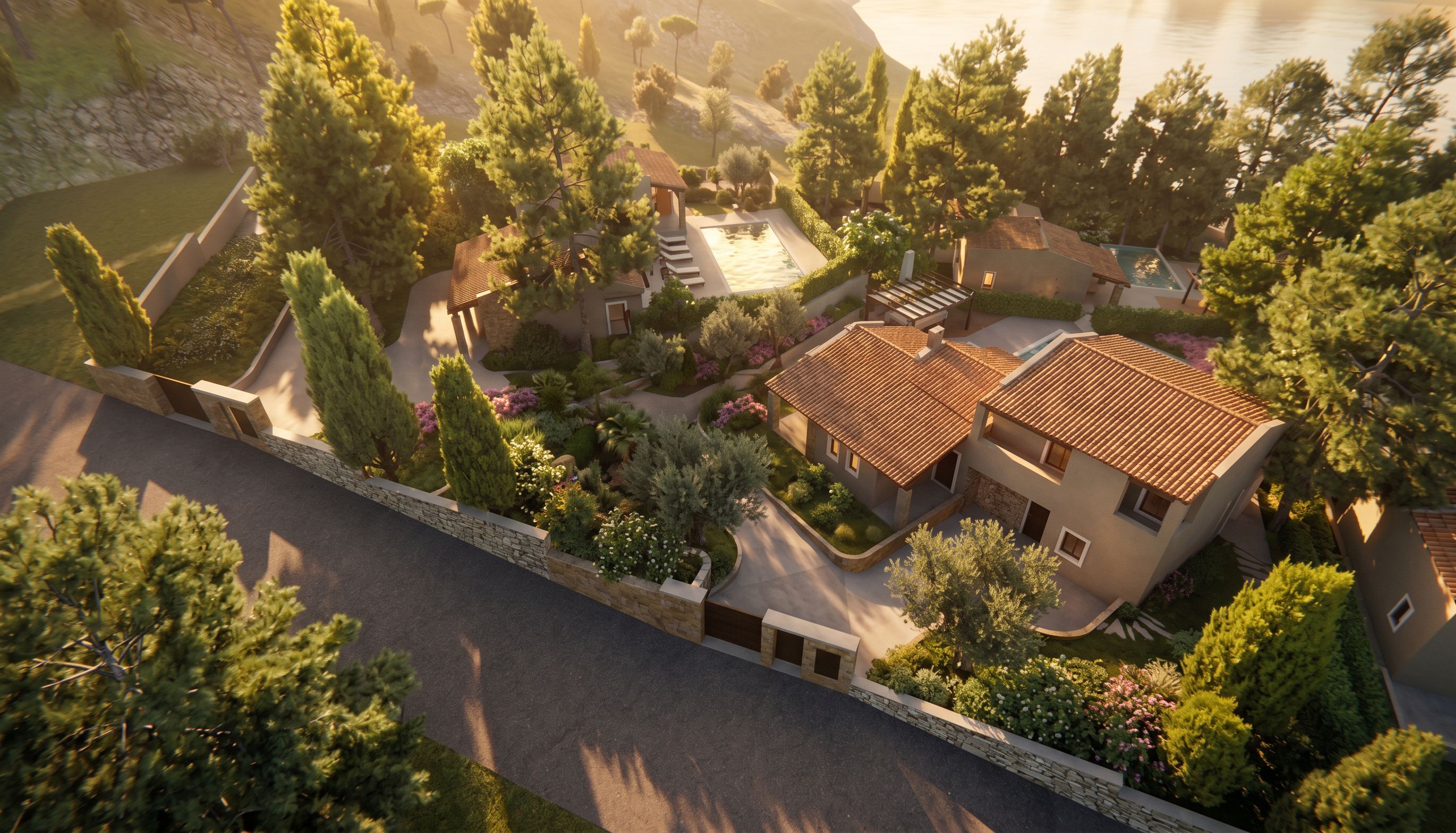 PromptIn the right building do the same openings with the reference pic. In the right building do the wooden door on the floor glass door, keep exact camera angle