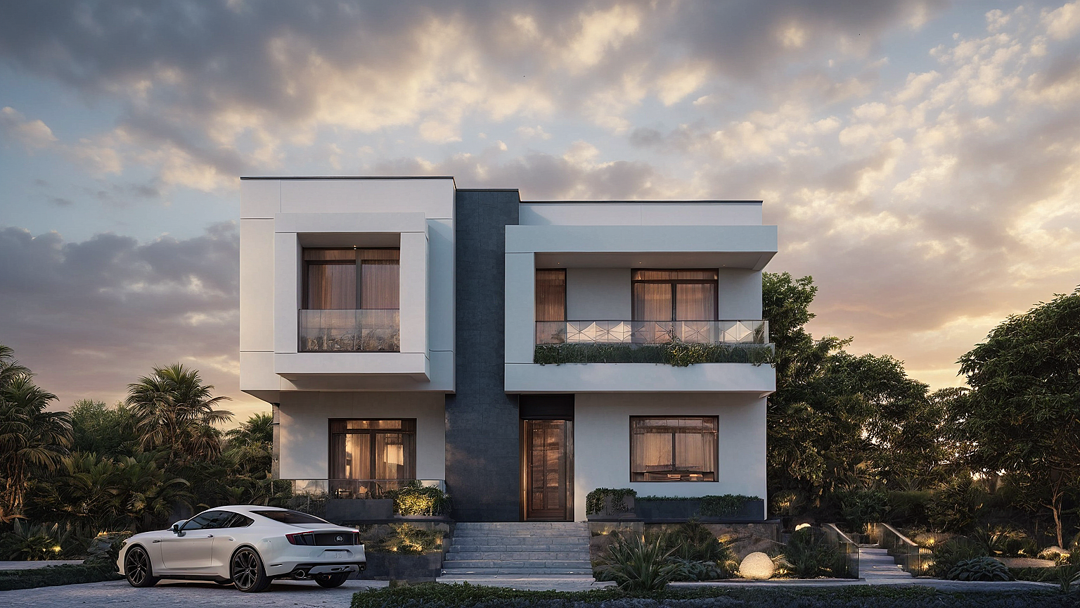PromptUltra-modern villa with large glass facades, minimalist architecture, flat roof, maintain paint color and wood finishes, sunset lighting, photorealistic rendering, 4K resolution