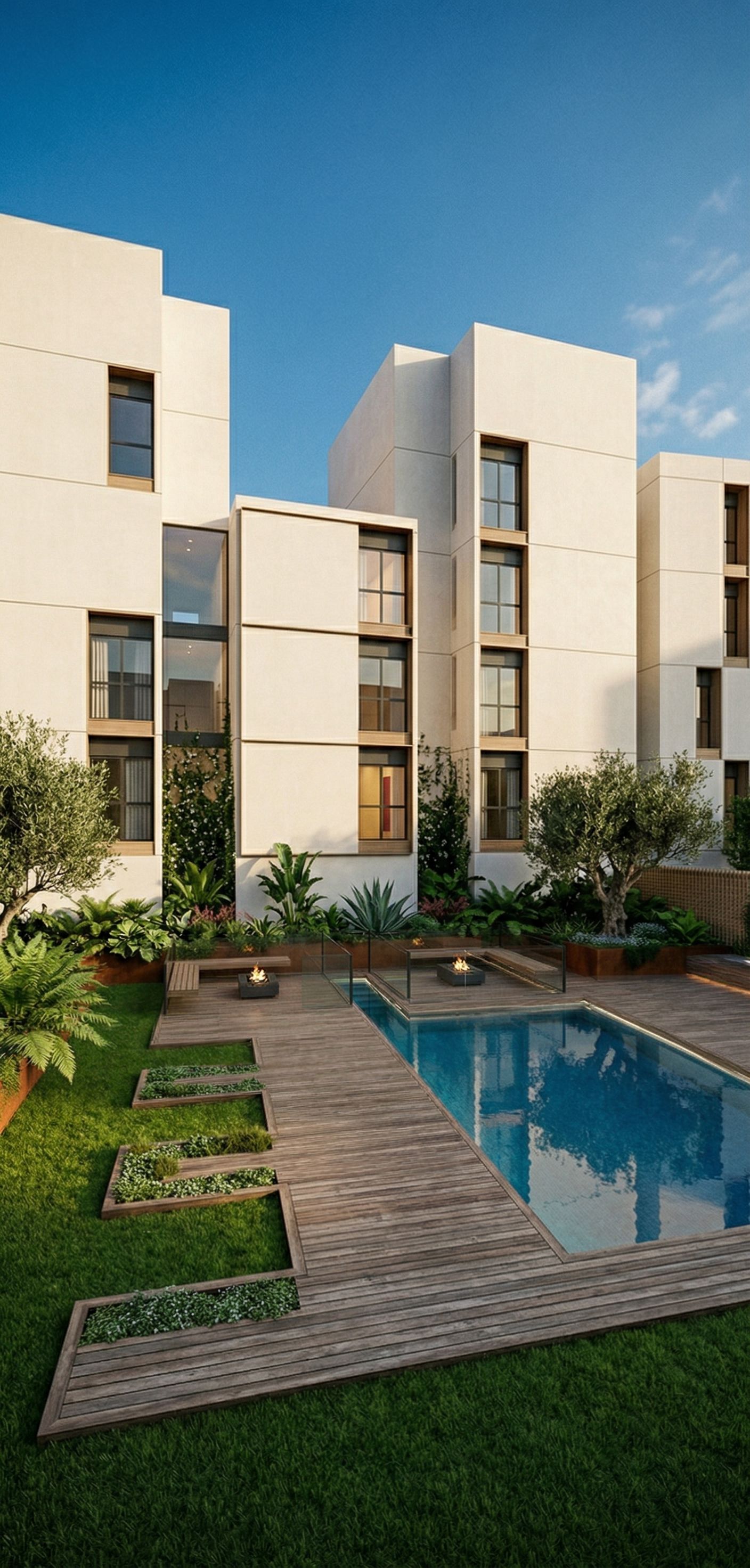 Promptno cambies la distribucion ni volumetria, es un proyecto moderno, contemporaneo, donde el jardin con la pisicina cobran protagonismo, los suelos marrones son madera y los verdes cesped, , keep exact camera angle