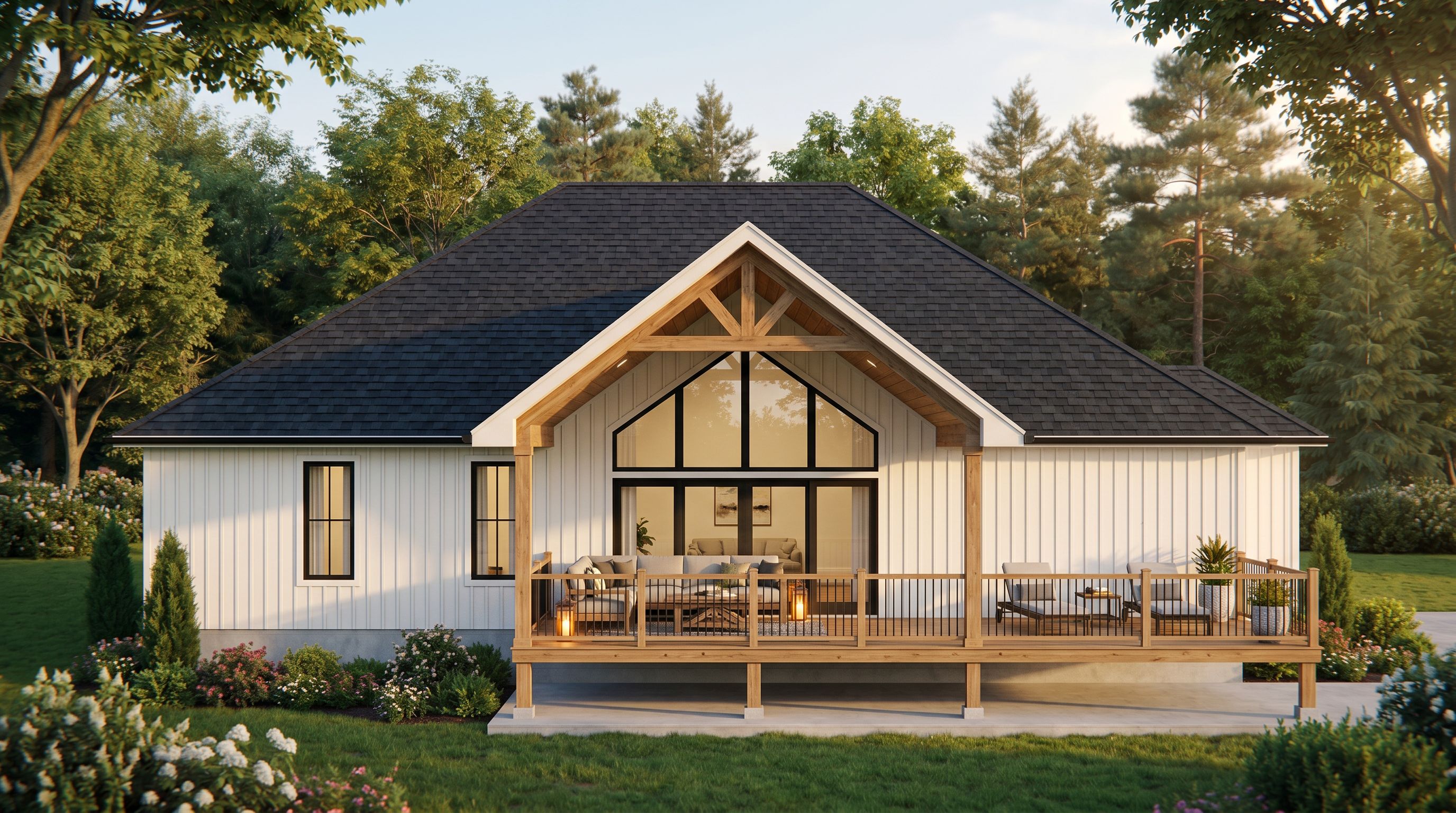 PromptA photo of a rear covered deck, white vertical siding, concrete foundation, wood decking with a large triangle patio door system, black shingle roof, the reference image shown is the front of this home, please match the style attached to this render, show a sundeck on the right, and covered deck with furniture in the middle, wood railing with black spindles, no stone at rear, show two windows on the left, a big patio door window system in the middle and no windows on the right side of the rear., keep exact camera angle