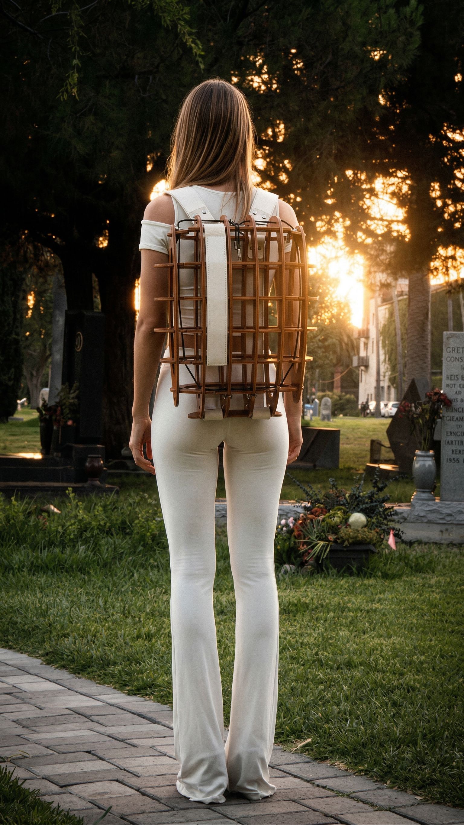 PromptPlace on the girl's back the backpack "identical" to the wooden backpack shown in "reference images 1, 2 and 3"., keep exact camera angle