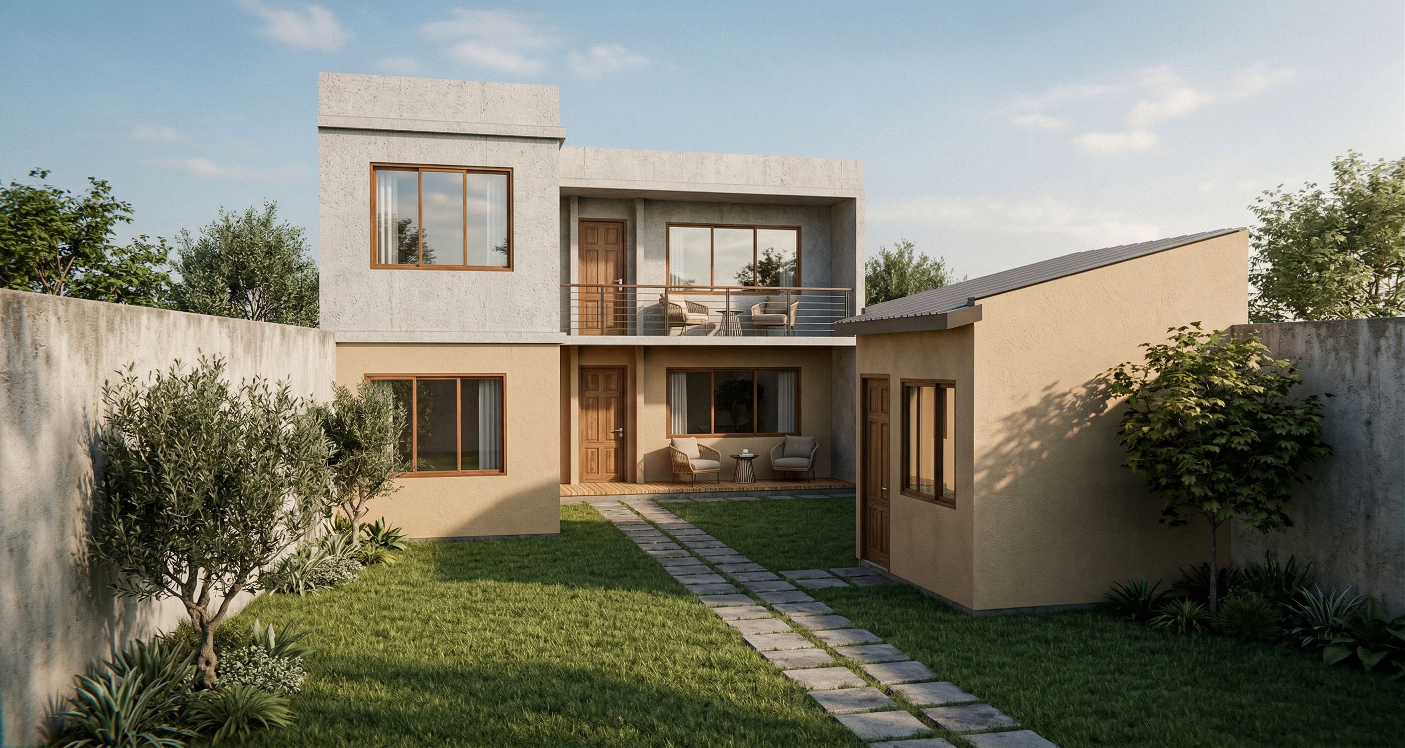 PromptPhoto of a modern residential complex featuring two distinct structures connected by a stone pathway. The main building showcases large windows with wooden frames and a balcony, complemented by a contemporary design using a mix of gray and warm earth tones. The surrounding environment boasts lush green grass and simple landscaping. Soft, natural sunlight casts gentle shadows, enhancing the textures of the buildings. Captured from a slightly elevated angle with a wide lens, offering a harmonious view that highlights both the architectural details and the inviting outdoor space. put outdoor balcony seats on the upper level, keep exact camera angle