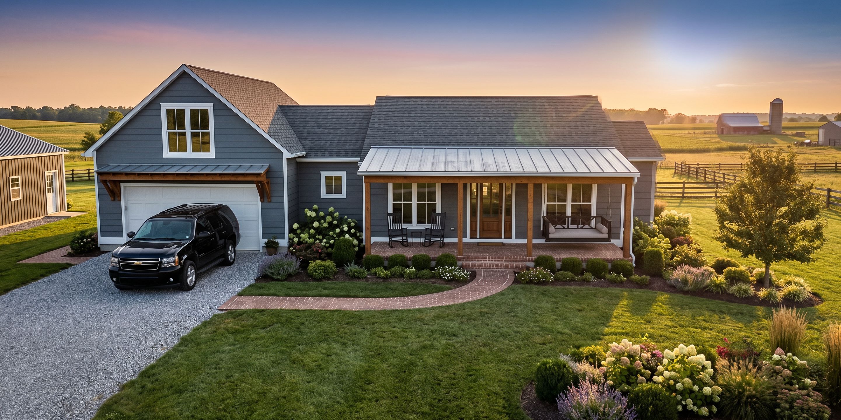 Promptbrand new farmhouse built on beautiful country farmland. crisp slate gray siding with white trim, white vinyl windows, galvanized metal standing seam porch roof and dark gray asphalt roof. 20' wide gravel driveway, brick walkway, brick front porch and beautifully landscaped yard., keep exact camera angle