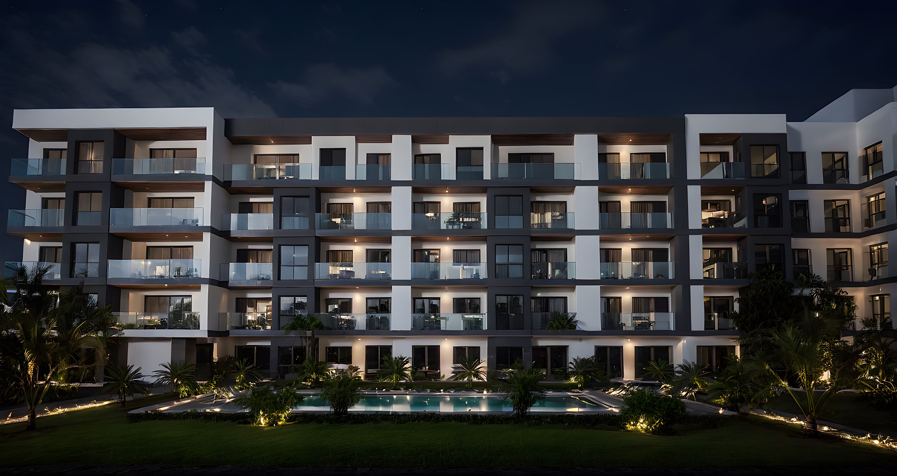 PromptThe nighttime photograph was designed using realistic materials and facade lighting. The photograph depicts a contemporary, multi-story residential building constructed with a combination of dark gray concrete and white facade elements, adorned with concealed LED lighting, and featuring clean lines and open balconies. Surrounded by a lush lawn and palm trees, the building overlooks a tranquil pool area. The camera was shot from a low perspective, emphasizing the building's height and structure, and a wide-angle lens was used to capture the entire scene.