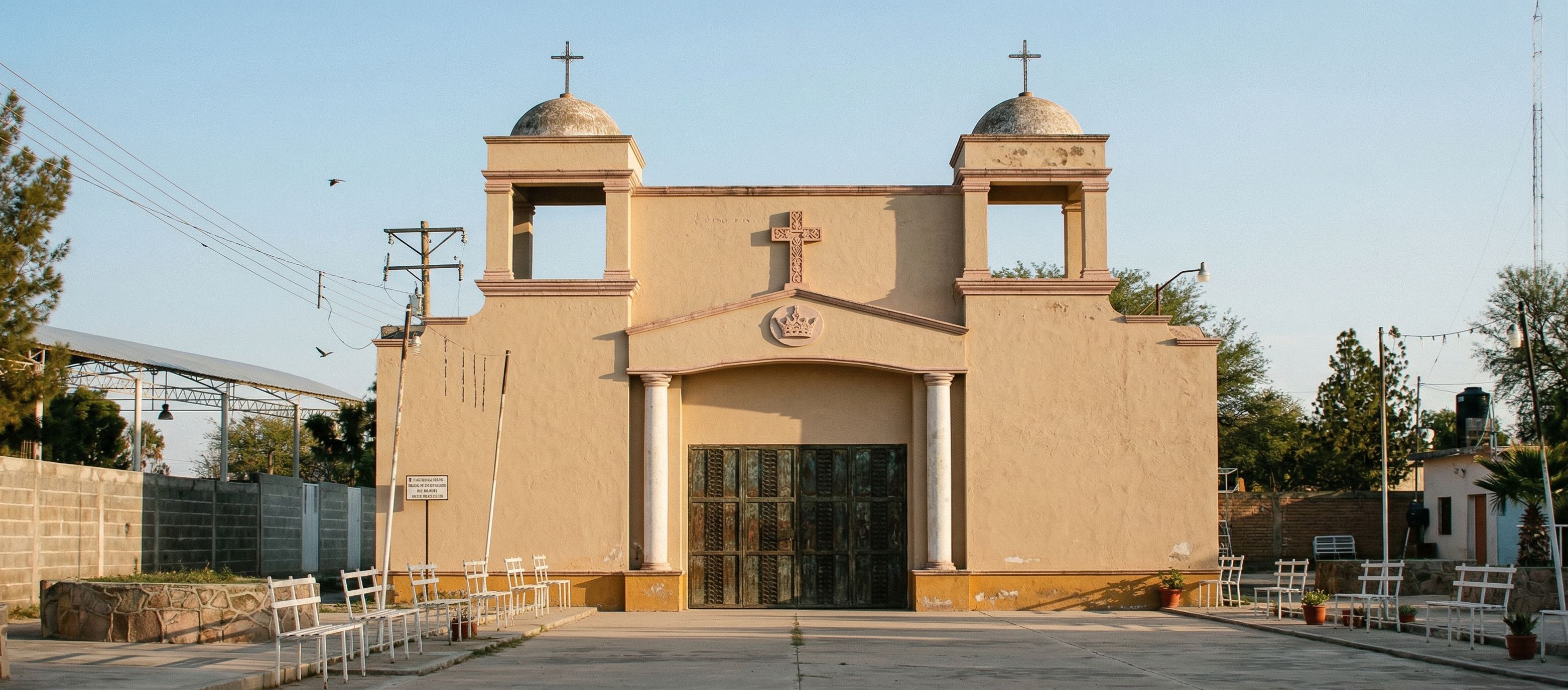 PromptFoto de la fachada de una iglesia tradicional con campanarios prominentes rematados con cúpulas, hechas con estuco beige cálido y portones metálicos como en la imagen de referencia, las molduras están hechas de piedra de cantera, las columnas son blancas, coloca la imagen original en el centro de la imagen de referencia, respetando el entorno que la rodea donde se encuentra, Se respeta el diseño de la imagen original,en el centro del frontón tiene una corona tallada en relieve bajo y en la punta del frontón una cruz de piedra de cantera, keep exact camera angle