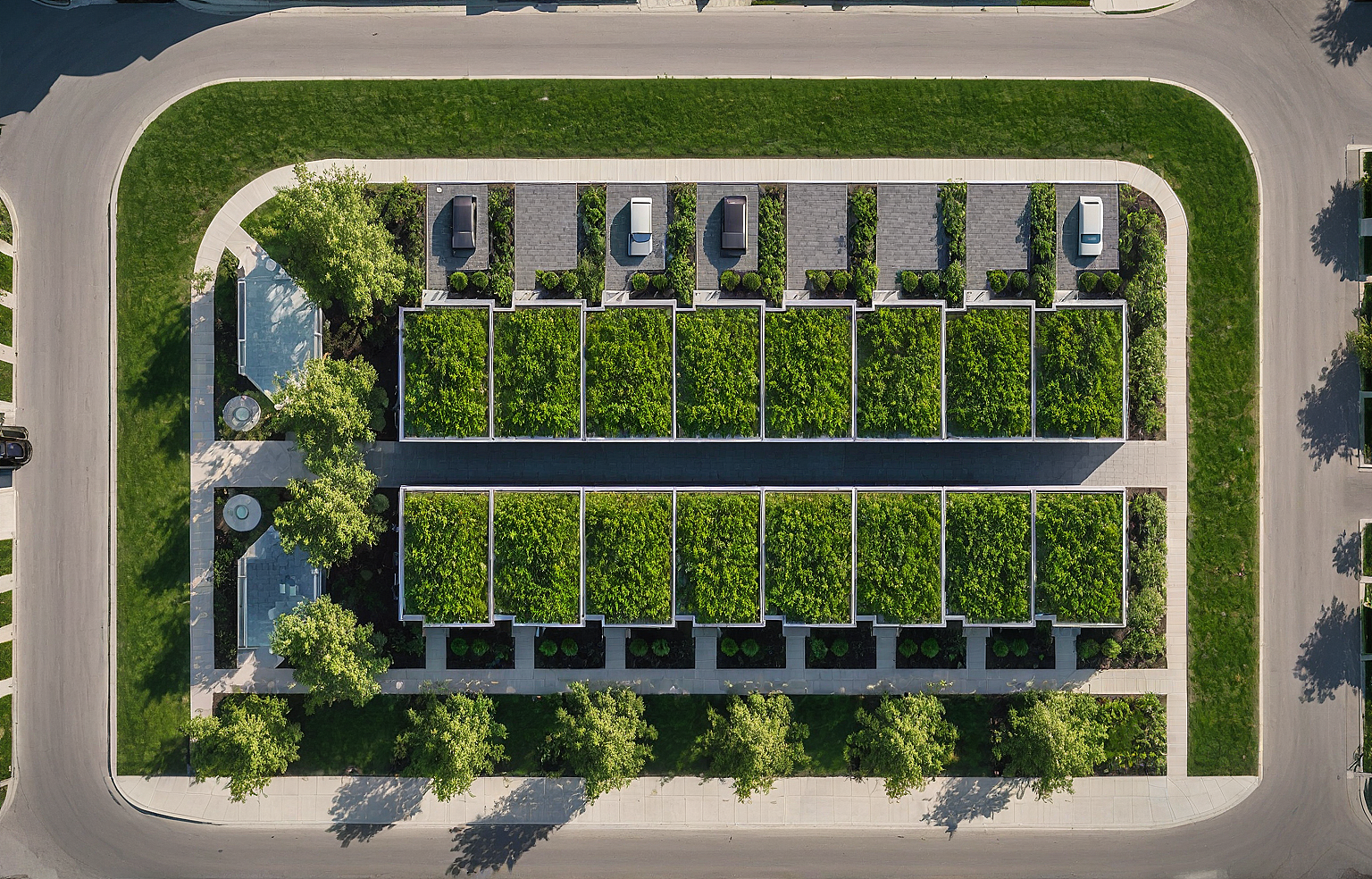 row of townhouse in a subdivision of Toronto with green roofs. sidewalks and city streets wrap around the houses