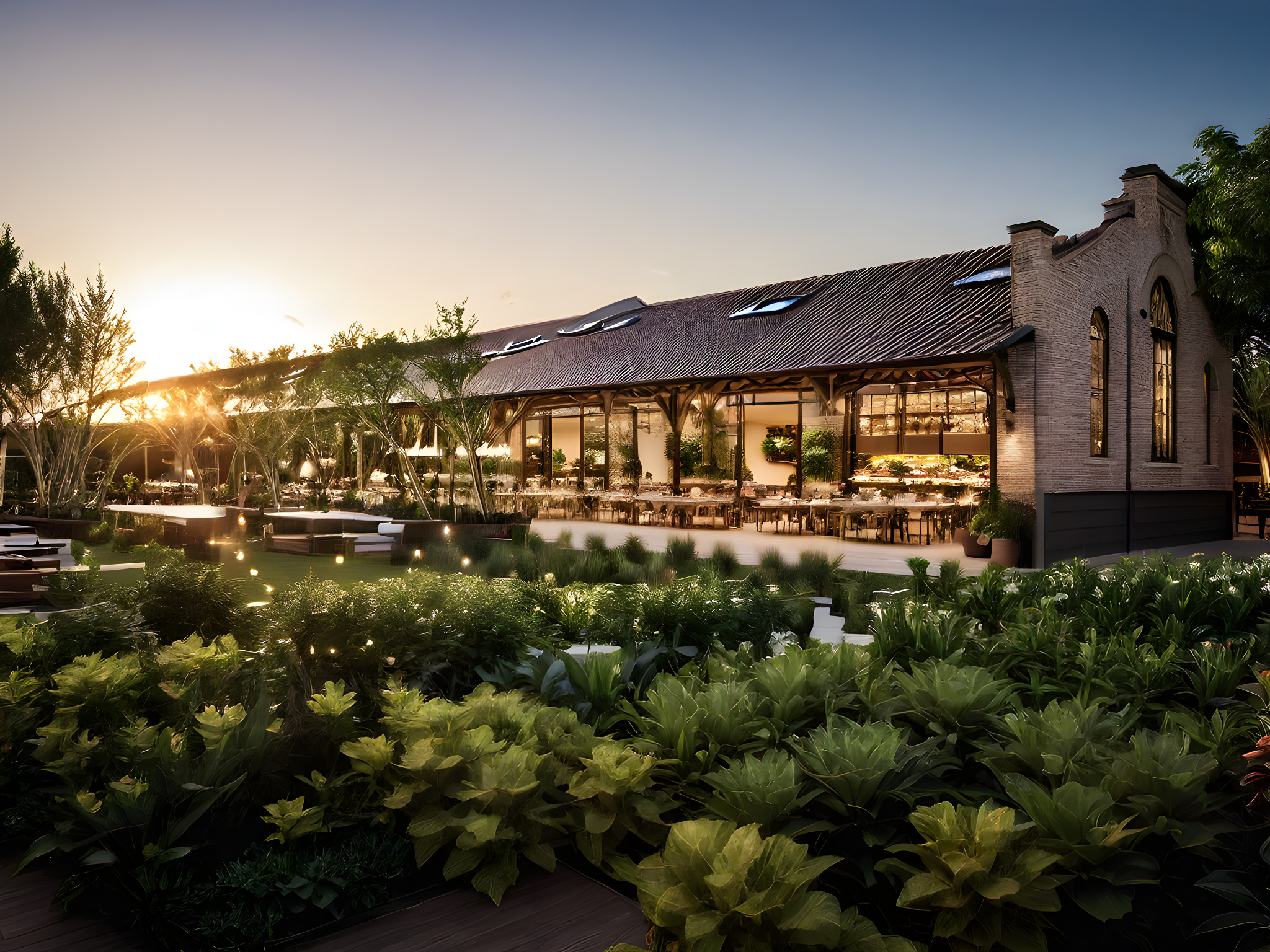 food hall, amazing garden, same construction materials, same facade, amazing terrace, sunset