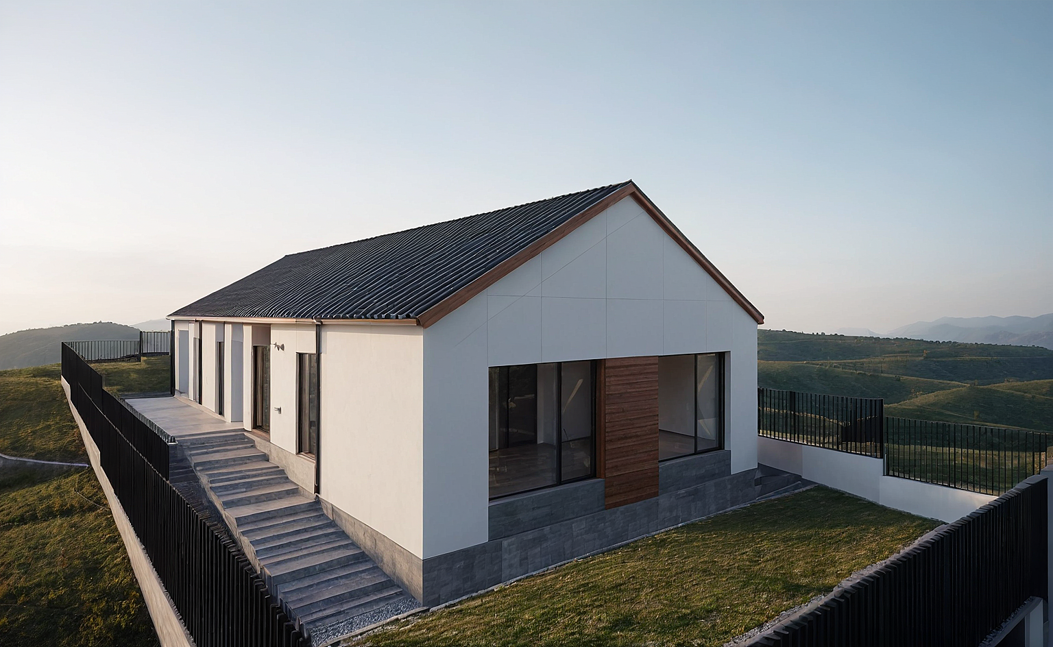 Promptmodern , hills background, , ad lighit insode house , minimalit creamic roof