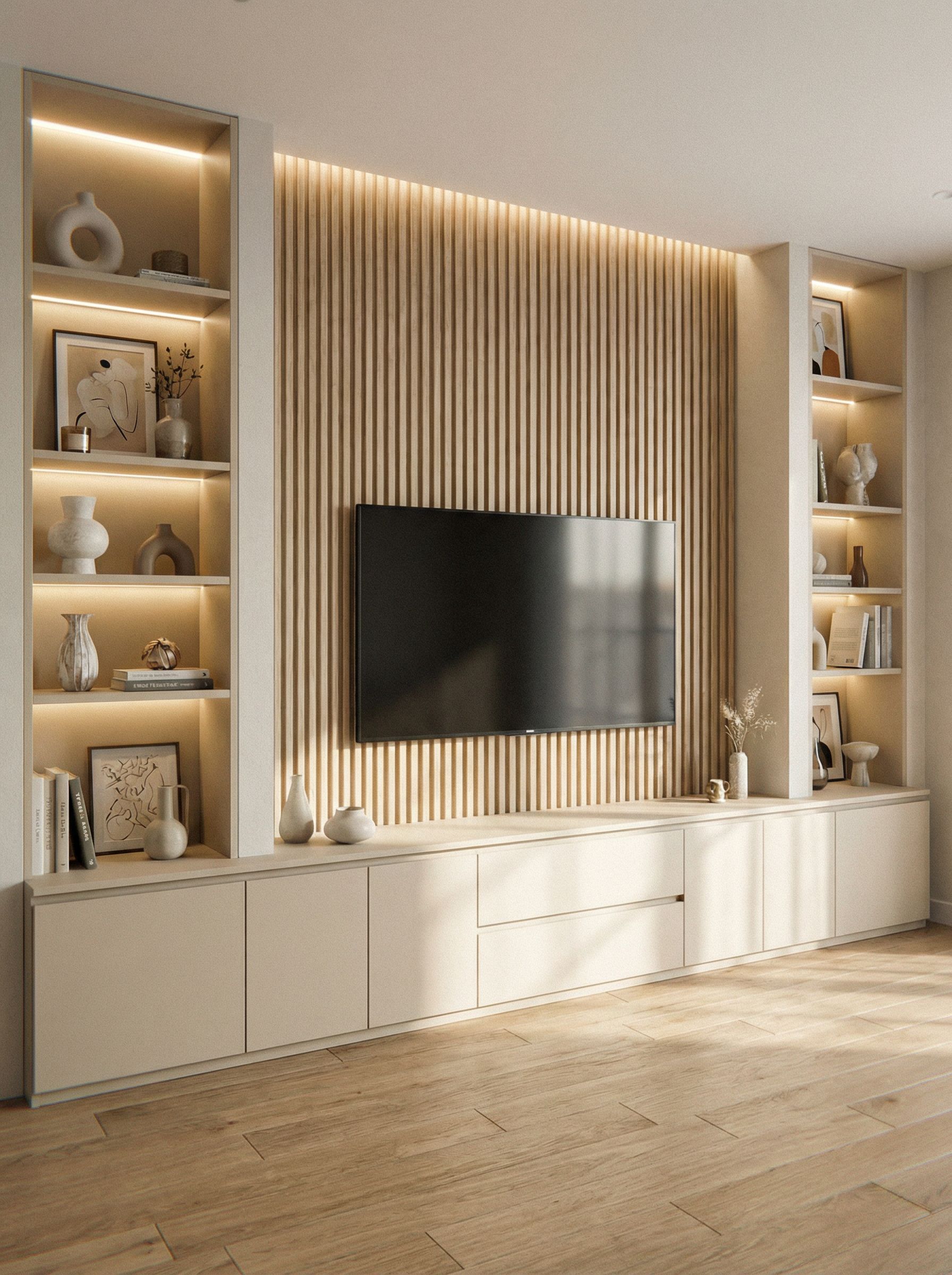 Convierte la distribución del alzado del alzado que está en líneas a esa misma distribución pero en perspectiva 3d. pon el la pared central detrás de la tele el material de revestimiento y la misma gama cromática de la imagen de referencia. utiliza un color crema medio para los muebles. Pon las estanterías con menos fondo pero al mismo nivel que los muebles bajos y al mismo nivel que los muebles bajos. Pon alrededor de los muebles paredes de pladur en todo el contorno a los muebles al mismo nivel que los muebles. Pon el suelo con lamas de madera tipo roble claro., keep exact camera angle